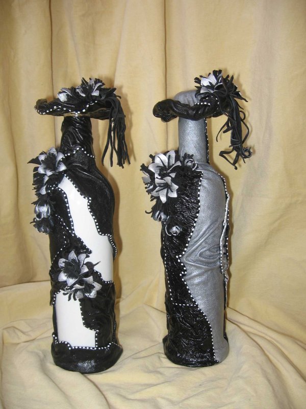 Декор бутылки тканью можно выполнить с использованием любого текстиля (капрон, лен, шелк). Стильно и роскошно будет смотреться кожа. Материю перед обертыванием бутылки вымачивают в клеевом составе. Затем ее прикладывают к стеклу, но неплотно. Получившиеся складочки придадут изделию дополнительный рельеф. Декор бутылок тканью часто комбинируют с техникой декупажа. Для изготовления нежного подарка для молодой девушки можно использовать шпагат (плотная ворсистая нить для обвязывания бумажных пакетов), мешковину и белое ажурное кружево. Бутылку очищают от этикеток, распыляют над ней серебристую краску из баллончика или посыпают блестками предварительно нанесенный клеящий состав. Когда поверхность подсохнет, тару частично оборачивают мешковиной, которую закрепляют клеем. По бокам грубый декор оттеняют белыми ажурными полосками кружева. Дополняют украшение бантиком из нескольких ниток шпагата на горлышке, белыми бусинами, текстильными цветами.