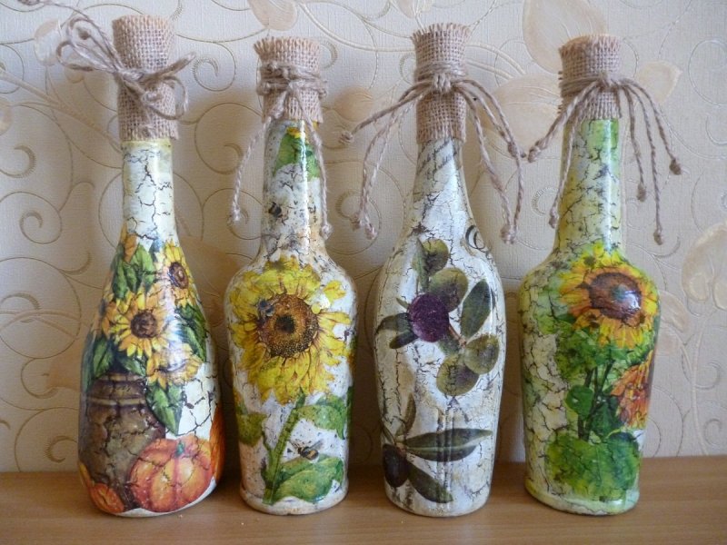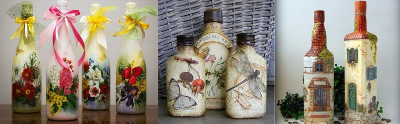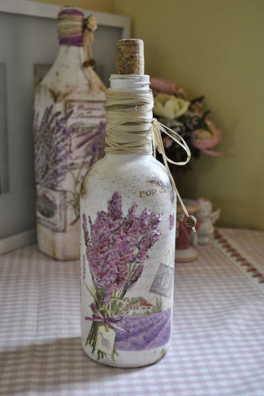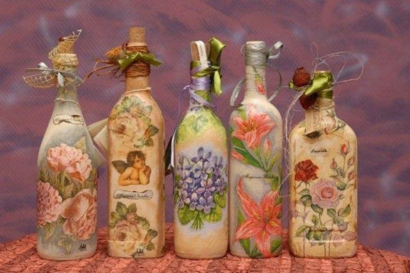 Декупаж относится к одной из излюбленных техник для начинающих мастеров декорирования. Изображения наносят только на гладкую, предварительно обработанную поверхность. Этикетку с бутылки снимают, затем протирают стекло ацетоном или спиртом для обезжиривания. После этого наносят слой грунтовки (акриловая краска), цвет которой хорошо сочетается с гаммой выбранной картинки (на тон светлее). Затем берут трехслойную салфетку (вырезку из журнала) и отделяют красочный лицевой слой. Его пропитывают в клее и сразу наносят на поверхность или сначала замачивают в воде (вариантов несколько).