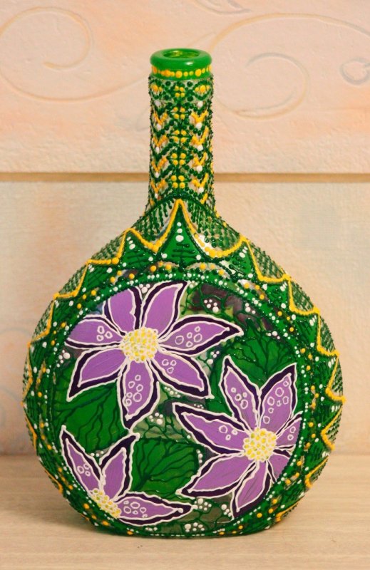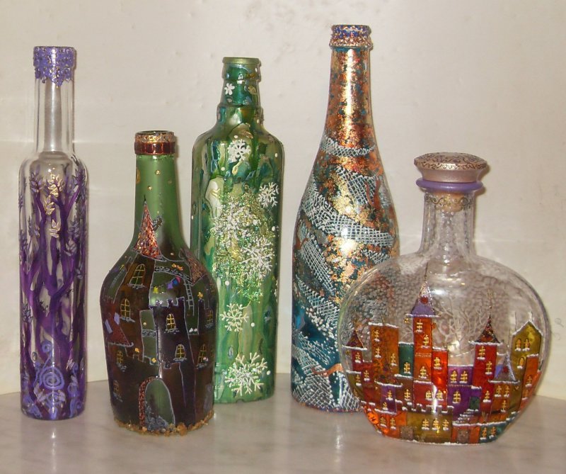 Красят бутылку обычно для создания красивого фона, на котором будут лучше смотреться основные украшения. Для стекла покупают акриловые краски. Окрасить бутылку можно как внутри, так и снаружи. Для внутренних работ состав просто заливают через горлышко и тщательно взбалтывают тару, чтобы он равномерно распределился. Затем бутылку переворачивают вверх дном и дают лишней краске стечь, а той, что осталась на стенках, просохнуть. Для окрашивания стекла снаружи можно использовать кисточки и спонжики. Рисунок наносят с помощью трафарета. Те области, которые должны остаться нетронутыми, можно заклеить малярным скотчем. Окрашивание из баллончика позволяет нанести ровный слой без мазков кисти. Этот же способ поможет получить эффект омбре (цветовая градация), так как каждый последующий слой аккуратно ложится на предыдущий, а интенсивность цвета регулирует сам мастер. Глиттер позволит создать яркий, праздничный декор. Блестки наносят на поверхность, которую предварительно смазали клеем. Лишние кусочки отряхивают. Работать лучше на газете, так как отходы можно собрать и аккуратно высыпать обратно в баночку для повторного использования.