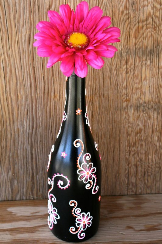 Бутылку в горячей воде очищают от этикетки, тщательно снимают слой клея. Затем на поверхность можно нанести краску из баллончика (к примеру, серебро), обернуть лентами или тканью. Когда фон будет готов, приступают к закреплению цветочных украшений. Сажают их на клей. Для композиции обычно выбирают место в центре (где раньше была лицевая этикетка) или же поближе к горлышку. Дополнительно букетик декорируют листочками из креповой бумаги или атласными лентами зеленого цвета.