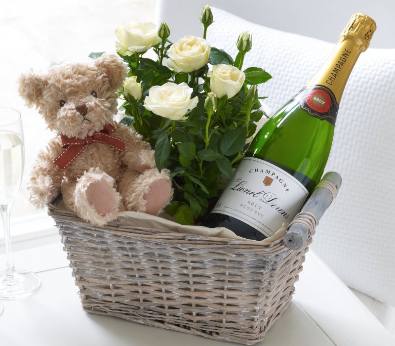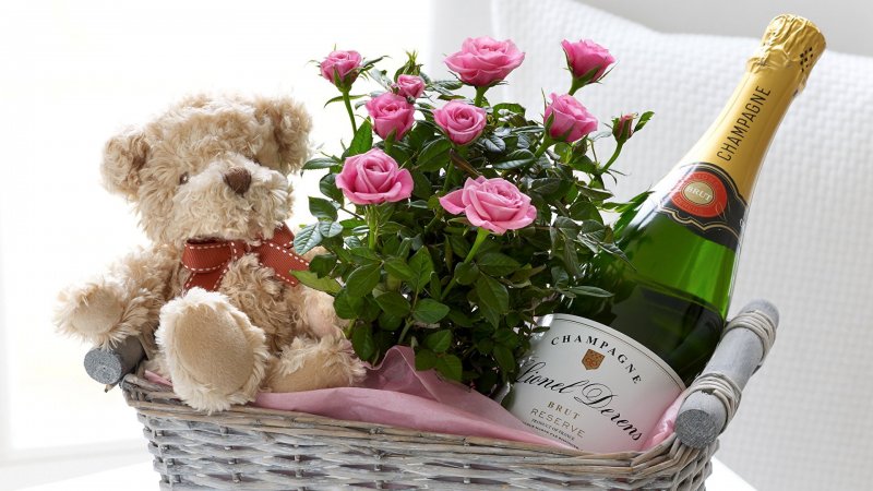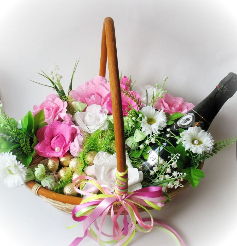 Затем приступают к формированию букета: начинают с краев, размещая декоративные веточки (спаржа лекарственная, писташ). Когда большая часть корзинки будет заполнена зеленью, в губку вставляют цветы — основу композиции. Здесь выбор ограничивается только фантазией мастера. Букет составляют из мелких роз, лилий, гербер, астр, пионов, тюльпанов. Чем короче стебель и меньше на нем листьев, тем больше воды достанется бутонам, а значит тем дольше они простоят. Букет дополняют бутылочкой вина и фруктами. Как вариант, такой декор можно расположить в одной стороне корзинки, а цветы — в другой.