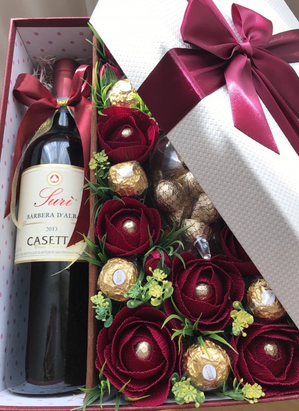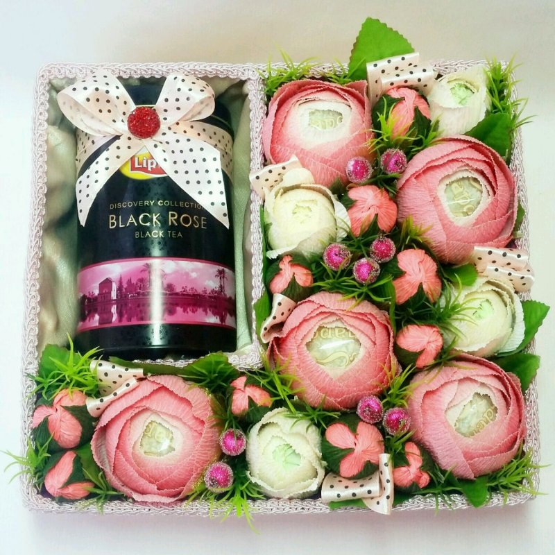 Совсем юных девушек порадует презент из бутылки, заполненной мелкими конфетами, жвачками или «тянучками». Как правило, такую тару частично окрашивают снаружи с использованием малярного скотча. Украшать бутылки можно любыми подручными материалами: пуговицами, фурнитурой, кусками ненужной ткани, бантиками, бисером, монетками, сеткой, пряжей. Подарок, выполненный своими руками, «согреет душу» получателю сильнее, чем любая приобретенная вещь. Возможно, потому что даритель вкладывает частичку тепла в свою работу и наглядно показывает, что не жалеет для любимой женщины самого ценного — свободного времени.