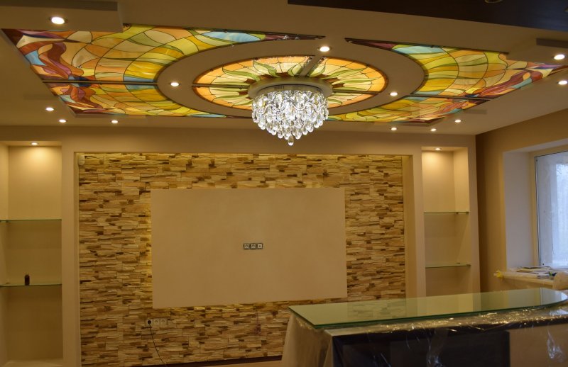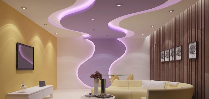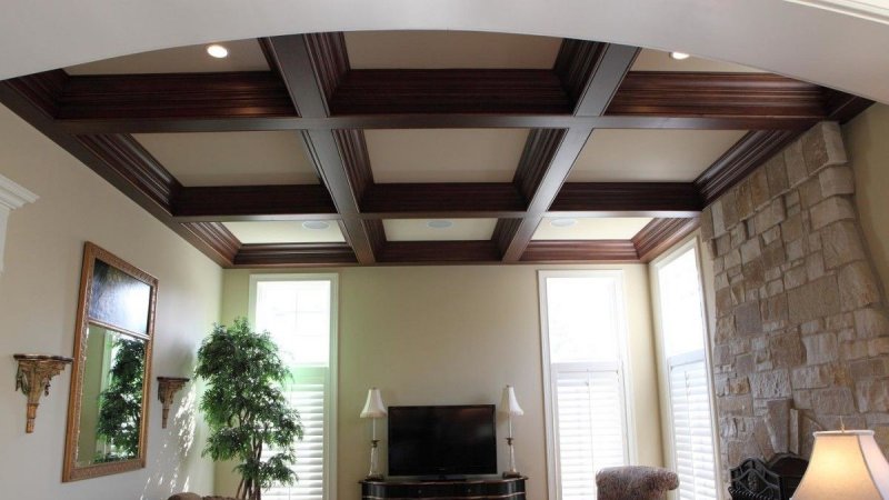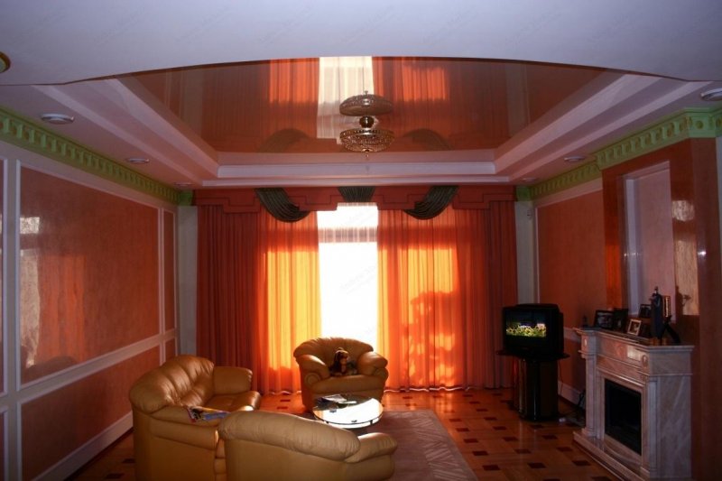 Если в гостиной имеется камин, то выступ над ним выделяют с помощью цвета (темнее, чем потолок).