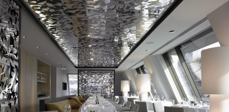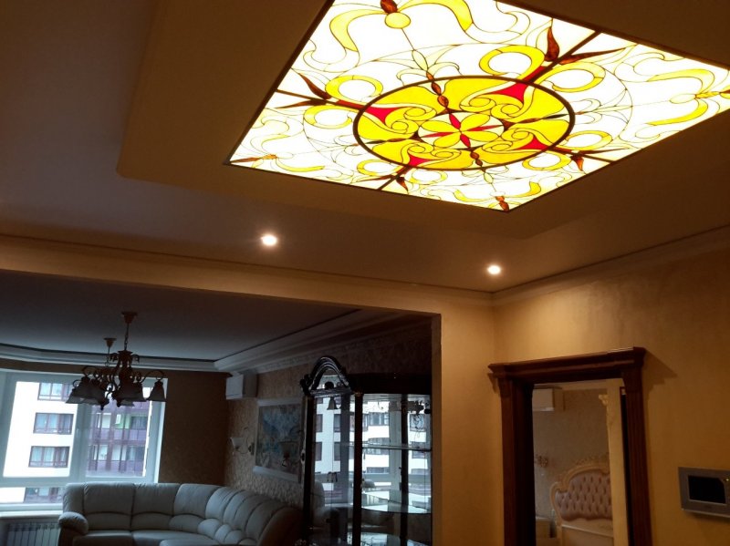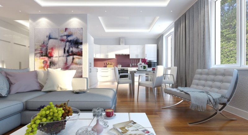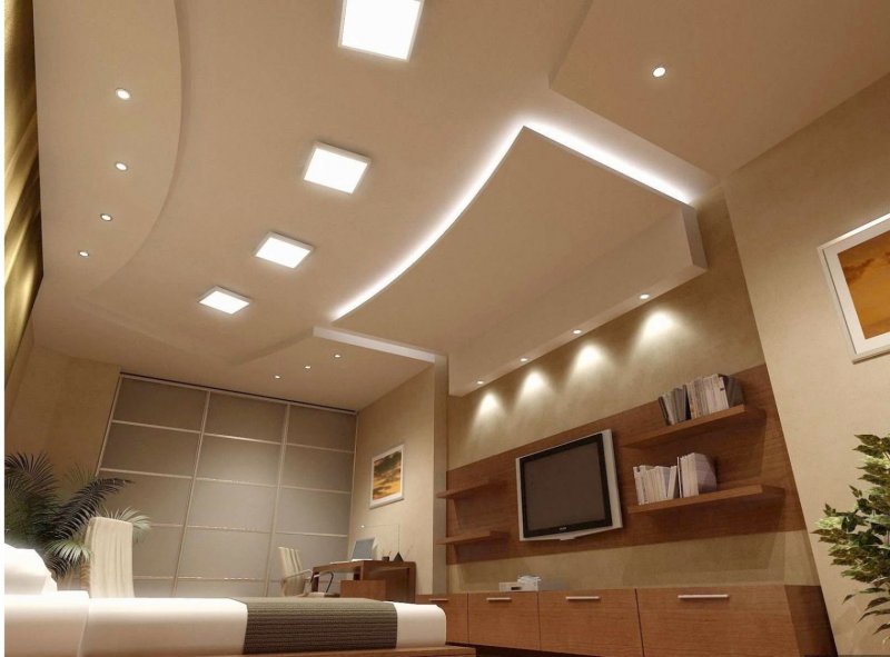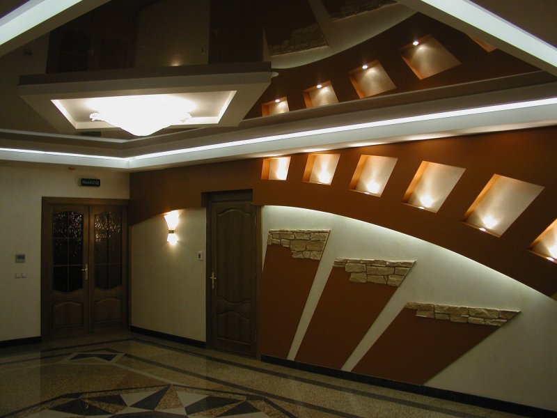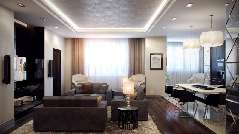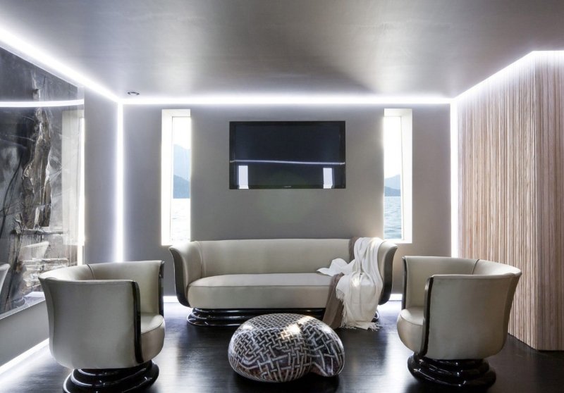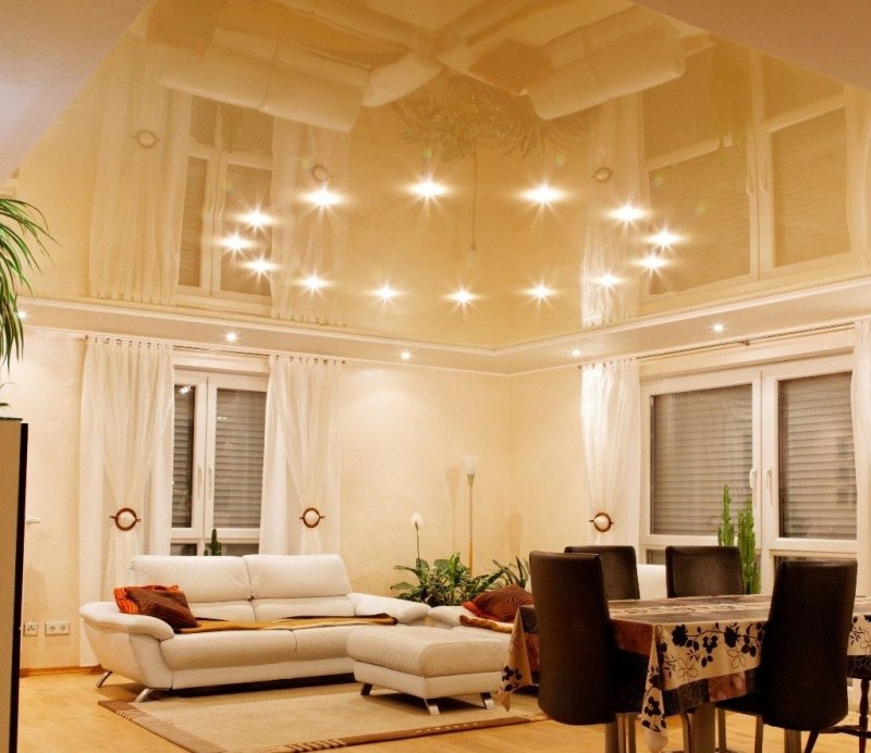 Как уже упоминалось выше, от любых объемных украшений на потолке придется отказаться. Люстры тоже входят в этот список. Если потолок украшает гипсокартонная конструкция, то ее выступы оснащают точечными светильниками. Такое освещение относят к декоративному, поэтому об основном источнике света все равно придется позаботиться. Центральную люстру заменяют группой светильников, которые размещают над каждой из функциональных зон комнаты. Плафоны декоративных торшеров и бра должны направлять свет не вниз, как в классических интерьерах, а вверх.