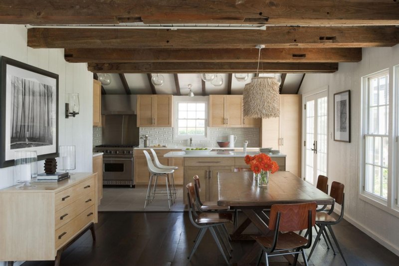 В последнем случае пример двоякий. Балки светло-коричневого цвета на фоне выбеленного потолка, могут сделать его выше, но только если сами перекрытия очень тонкие и аккуратные. Кстати, такое решение подойдет к фахверку или шале.