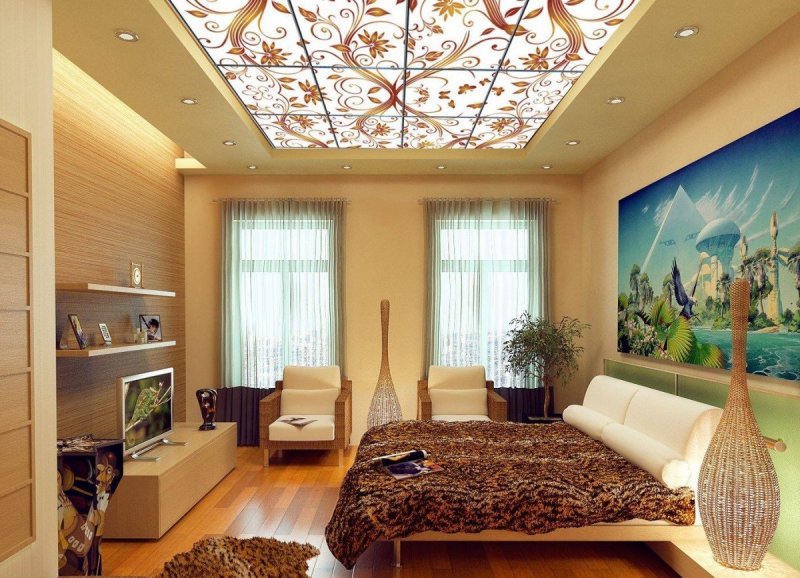 Каждую комнату следует декорировать низкой мебелью, чтобы свободное пространство между ней и потолком сохранялось в пределах привычного. Для спальни подойдет невысокая (возможно, навесная) кровать, будуарный столик такой же высоты с вытянутым зеркалом. Столешницы прикроватных тумбочек традиционно идут вровень с постелью, поэтому здесь выбирают детали меблировки из обычного ассортимента. Дополнительно возле кровати ставят низкую оттоманку или скамеечку. Используют шкаф-купе с отражающими поверхностями фасадов. Гостиную украшают широким, плоским диваном, креслами и низеньким кофейным столиком. Вместо массивного стеллажа, используют группу полок.