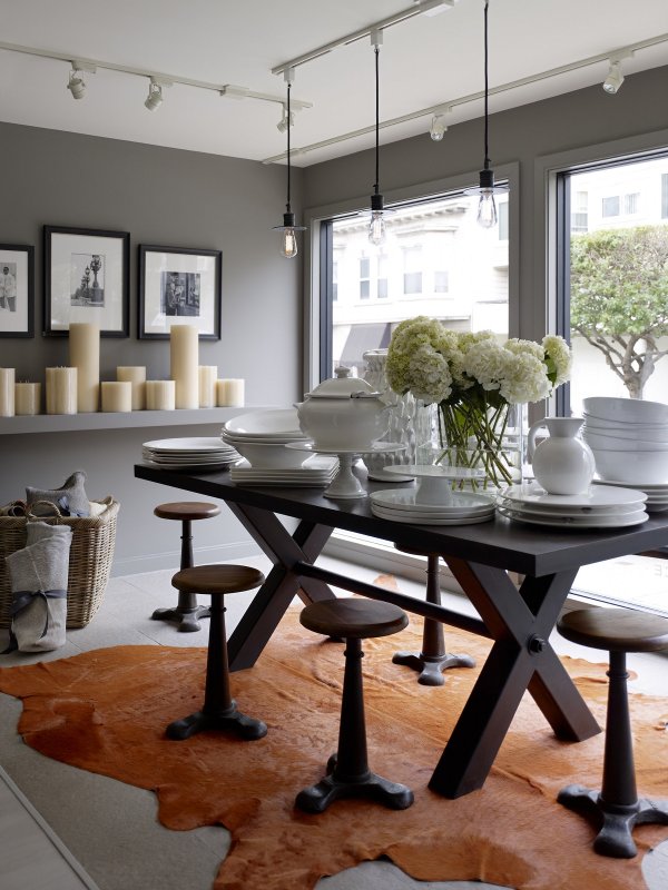 Для кухни приобретают оригинальный гарнитур: нижняя его часть имеет темный оттенок, а верхняя окрашена в более светлый тон. В других вариантах снизу используется система хранения закрытого типа, а сверху — открытого. В ванной комнате рекомендуют избегать размещения полноценной мебели (за исключением тумбы под раковиной). Чтобы разложить полотенца и бытовые мелочи, на стены вешают вертикальные короба с полками для хранения.