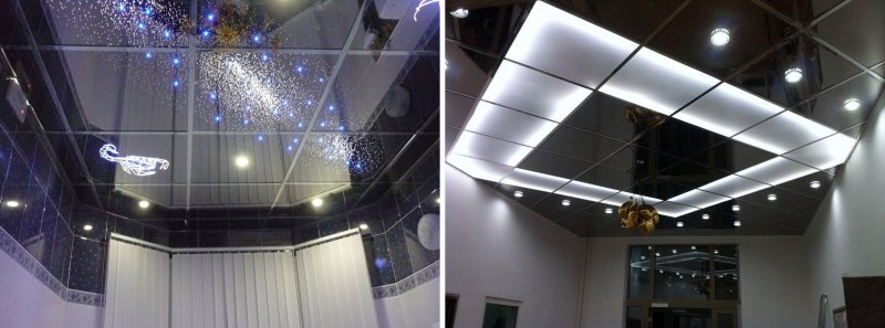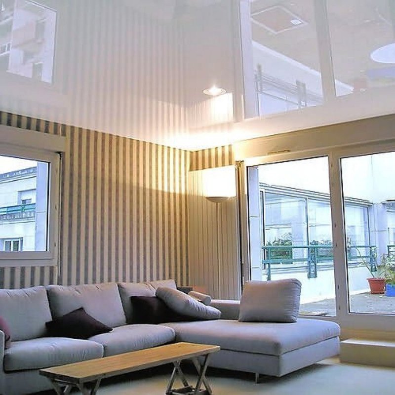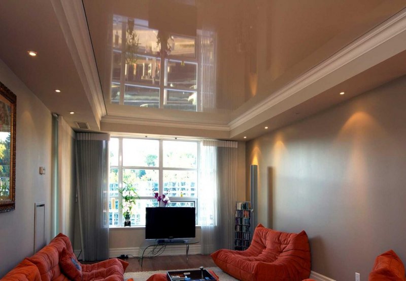 Потолок можно не только оштукатурить, но и покрыть белой краской с глянцевым блеском. Отражающая поверхность создаст иллюзию «бездонности». Конечно, красивее смотрелось бы натяжное полотно, но конструкция «съедает» слишком много пространства, которое не компенсируется глянцем.