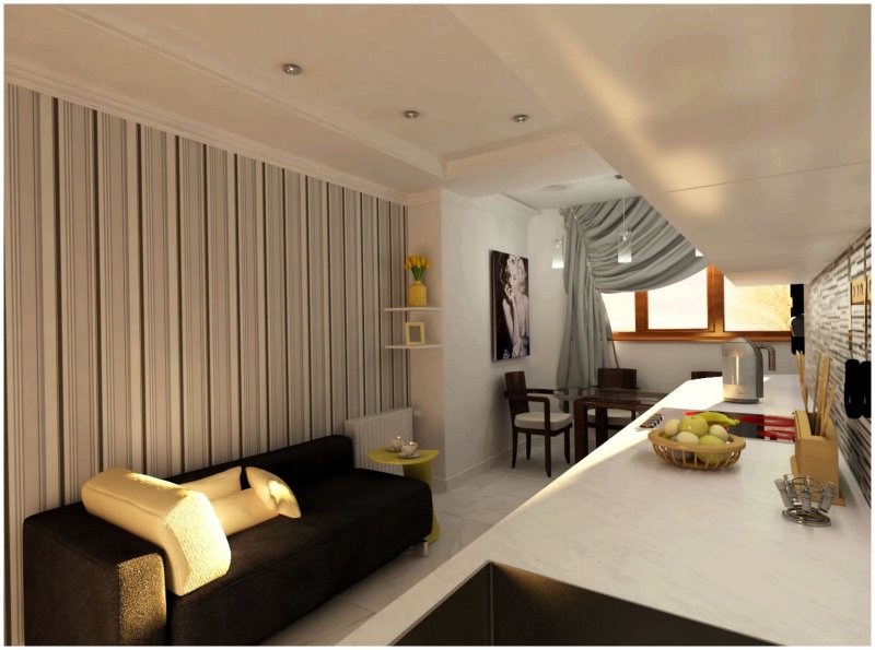 Декором можно скорректировать интерьерную картину. В данном случае украшения помогут поддержать эффект удлинения комнаты. Шторы следует выбирать либо однотонные из легких тканей, либо чуть плотнее с вертикальным рисунком (ромбы, овалы, полосы). Можно специально подобрать текстиль под орнамент на стенах. Мелкий живописный декор (фото, картины, постеры) располагают вертикально. Желательно, чтобы подобные украшения имели пару с сюжетом, связанным с ними по смыслу. Карниз нужно устанавливать прямо под границей между потолком и стеной. Нельзя вешать конструкцию даже с небольшим отступом от этой линии, так как она горизонтально раздробит пространство, чего допускать нельзя. Шторы должны ниспадать от самого потолка и до пола. Не рекомендуют использовать короткие занавески, как на кухнях, оформленных в стиле кантри. Не стоит украшать текстиль подвязками. Шторы должны просто отодвигаться в стороны, подчеркивая идеальную геометрию окна. Даже мелкий декор, который размещают на полках и свободных столешницах, должен быть слегка вытянутым вдоль вертикальной оси.