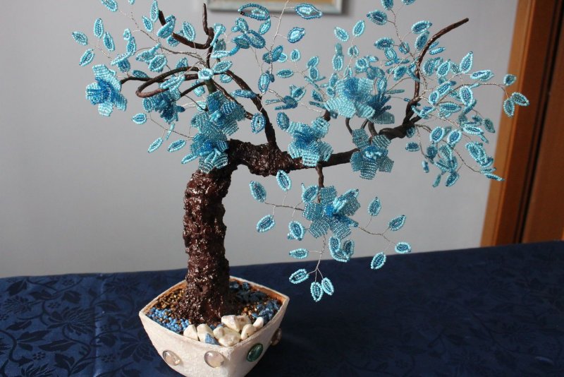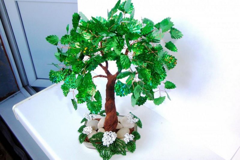 Перед началом изготовления топиария нужно нарисовать схему и картинку. Крона дерева счастья может представлять собой обычный разноцветный шар или сочетание необычных фактурных изделий. Бисер очень мелок, поэтому он не прикрепляется на основу для кроны по одной штучке. Для этого берется тонкая проволочная нить, на которую и надеваются бисеринки определенного цвета и фактуры. Проволока прочна и может самостоятельно держать форму, благодаря чему верхушка топиария может быть превращена в целый цветник бисерных переплетений. Стразы также прикрепляются к основе кроны на ленте. Бисером и стразами следует украсить ствол деревца (обычные палочки для суши) и подставку. В качестве подставки можно взять элегантный цветочный горшок, железное ведерко, большой камень или просто гипсовую массу на решетке, окрашенную затем в нужный цвет. Затем горшок для топиария нужно оформить бисером.