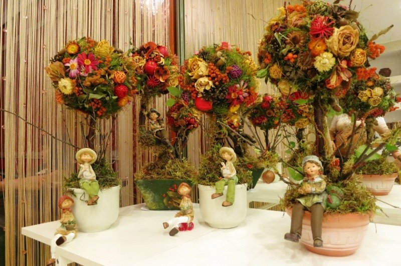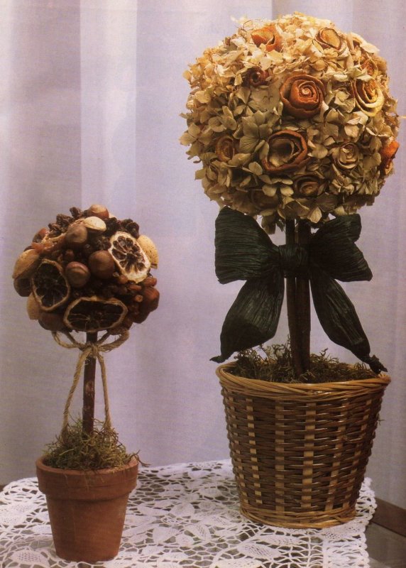 Деревце из сухоцветов делается достаточно просто. Можно украсить основу для кроны топиария засохшими цветами и пожелтевшими листьями, но цветочки и листочки, взятые для этих целей, должны быть крепкими и плотными, иначе они просто развалятся во время работы. Сухоцветы закрепляют прямо на пенопластовый шар. В качестве ствола берут изогнутую веточку с улицы, а в подставку превращается обычный глиняный горшочек. Горшок внутри заливают алебастром, предварительно фиксируя ствол топиария. Этот ствол вставляется в готовую крону дерева, а засохший алебастр декорируется сухими листьями и цветами. Топиарии из живых цветов обычно создаются профессиональными флористами, но можно попробовать сделать его дома самостоятельно. Для этого надо взять бутоны роз, цветки ромашки, лилии или хризантемы, правильно и осторожно срезать их состебля и прикрепить на основу кроны. В остальном методика производства деревца счастья и декора горшка для топиария схожа с его изготовлением из сухоцветов.