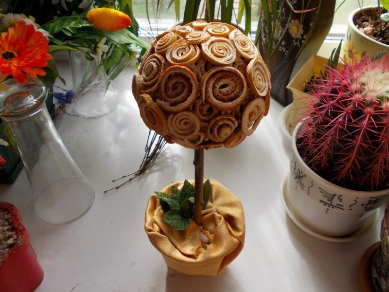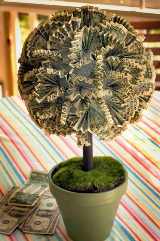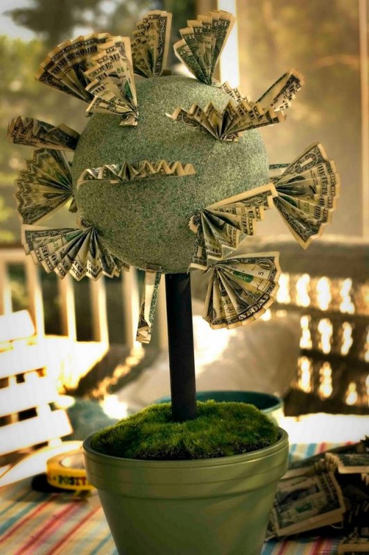 Этот топиарий обычно делается из фальшивых купюр, но для антуража можно прикрепить на крону дерева или подставку настоящие монеты. Конечно, лучше использовать не обычные, а редкие, старинные или иностранные монеты. Для начала каждую купюру нужно сложить пополам, чуть сдвинув края, а затем сложить из нее конвертик, закрепив неровные края двухсторонним скотчем. Количество купюр зависит от размеров шара-основы, но традиционно требуется около 20-25 купюр. Ствол денежного дерева можно сделать из веточек или палочекдля суши, а в качестве подставки взять кашпо. Кашпо с внешней стороны можно украсить специальной самоклеящейся бумагой с изображением денег или кружевами. В сам горшок заливают алебастр, ставят в него ствол и дожидаются его засыхания. После этого грунт топиария выкладывают монетами, опилками древесины или декоративным икамнями.