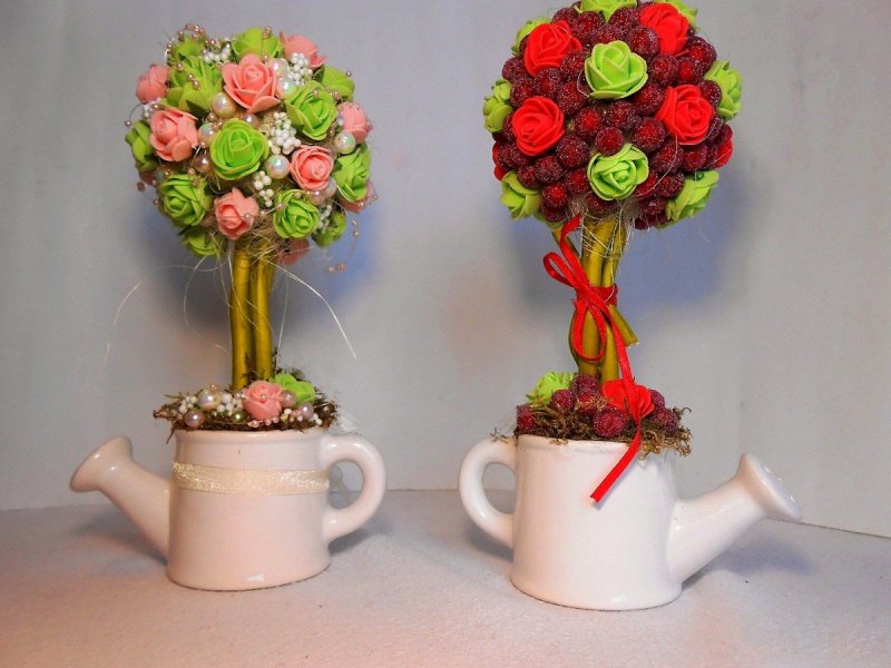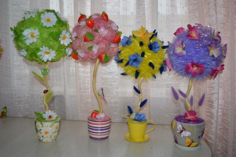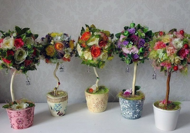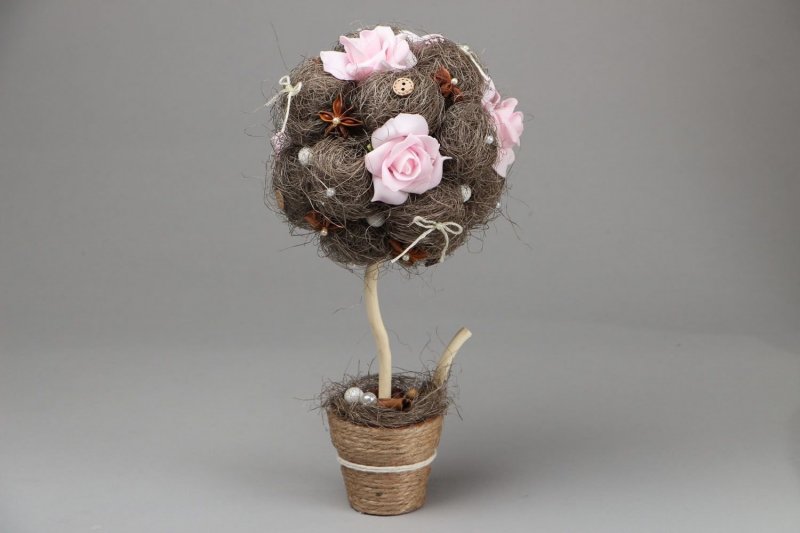 Декоративные деревья своими руками способны украсить любой интерьер. Их можно сделать из любых подручных материалов: ниток, атласных лент, шишек или ракушек. Также деревца счастья делают из живых цветов, но подобные композиции не всегда получаются у непрофессионалов. Обычно их делают флористы для свадеб. Ведь при их оформлении требуется не только крепко зафиксировать крону деревца счастья, но и правильно подготовить используемые цветы. Если срезать цветок неправильно или расположить его с недружественным для него растением, то он быстро завянет, а топиарий потеряет свой стильный внешний вид. Топиарий или бонсай подойдут для украшения гостиных, спален или детских. Они дополнят необычные дизайнерские решения и сделают эти интерьеры по-домашнему уютными и спокойными. А по фэншую правильное расположение и стильное декорирование топиария принесет в дом счастье, здоровье и богатство!