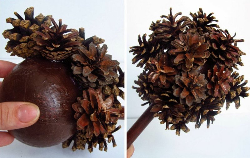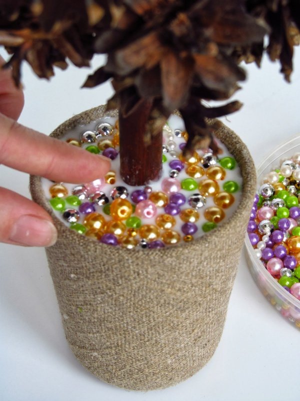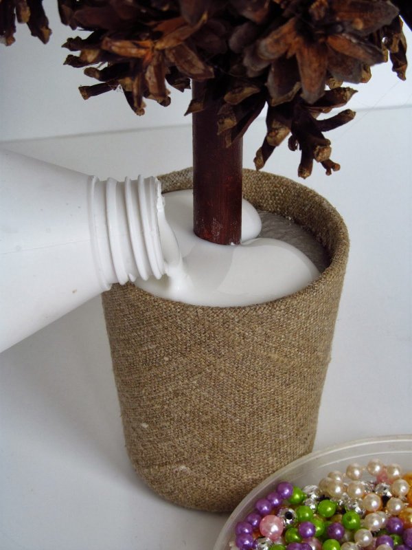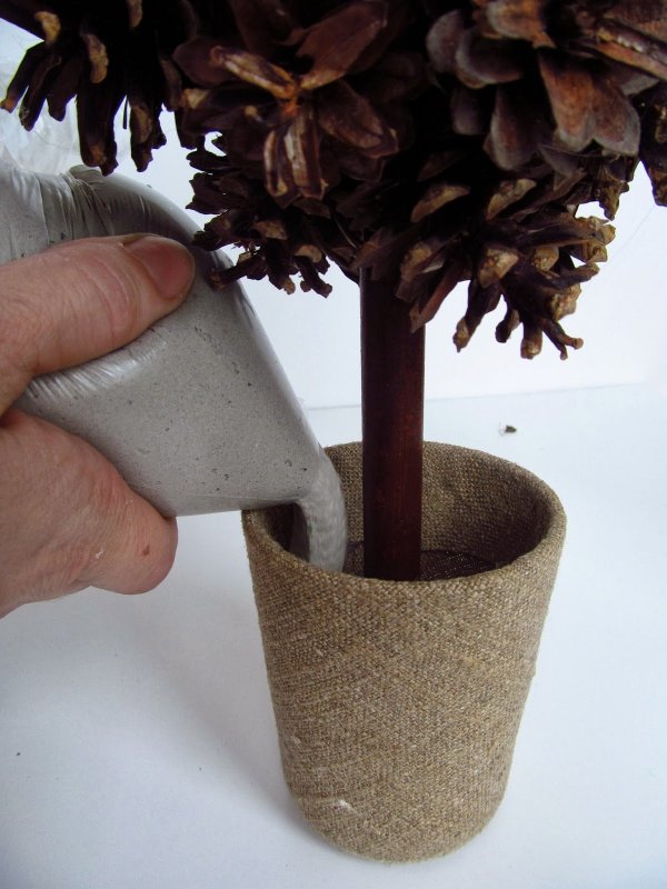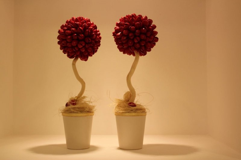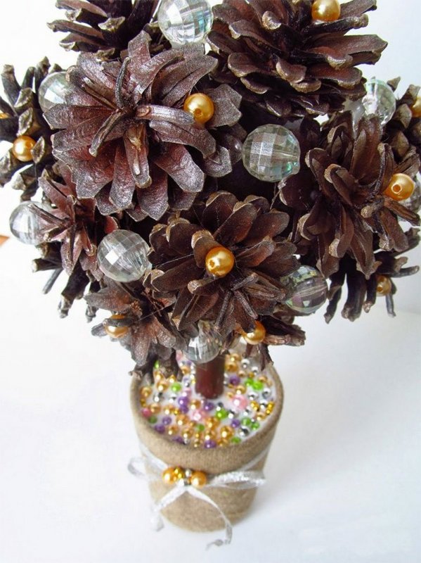 Топиарий из шишек своими руками изготавливается по схожей схеме. На пенопластовый шар приклеиваются небольшие сосновые полураскрытые шишки с маленькими промежутками друг от друга. Если промежутки получаются слишком большими, их можно заполнить желудями или каштанами. Для дополнительной фиксации элементов можно использовать золотистые или коричневые нити. Для изготовления ствола надо сложить вместе несколько (до 10) бамбуковых шпажек, обмотать их толстой белой или коричневой нитью, оставив по краям палочек открытые участки. Затем нужно развести алебастр с водой или взять готовую цементную смесь, налить ее в цветочный горшок и вставить в основу ствол деревца. Когда смесь застывает, ее украшают хвоей или сизалем, на ствол крепят полностью оформленную крону деревца счастья, а горшок декорируют атласной или ажурной лентой.