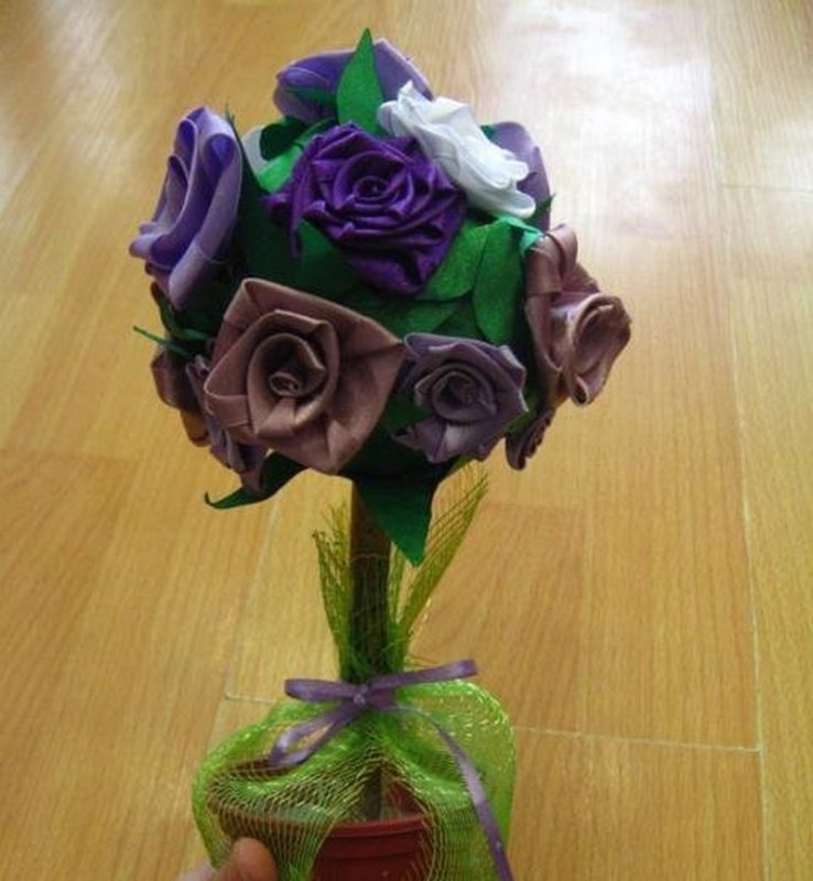 В качестве основы для топиария из атласных лент можно взять пенопластовую сферу или шарик из скомканных газет, закрепленный толстыми нитями, смоченными в клее ПВА. Затем нужно взять атласные ленты любых цветов, скрутить их в небольшие рулончики, предварительно сгибая ленты под прямым углом. Сгибать атласную ленту нужно несколько раз, пока ее длинане закончится. В результате этих действий должен получиться бутончик розы. По окончании изготовления необходимо прошить все лепестки тонкой шелковой нитью у основания. Количество таких розочек определяется размерами основания. Обычно требуется 20-30 цветков. Затем ими декорируют крону топиария. В качестве ствола для такого деревца можно взять обычную веточку, а для подставки использовать глиняный цветочный горшочек. Подставку и ствол дерева нужно украсить элегантными зелеными листьями из атласных лент или шелка.