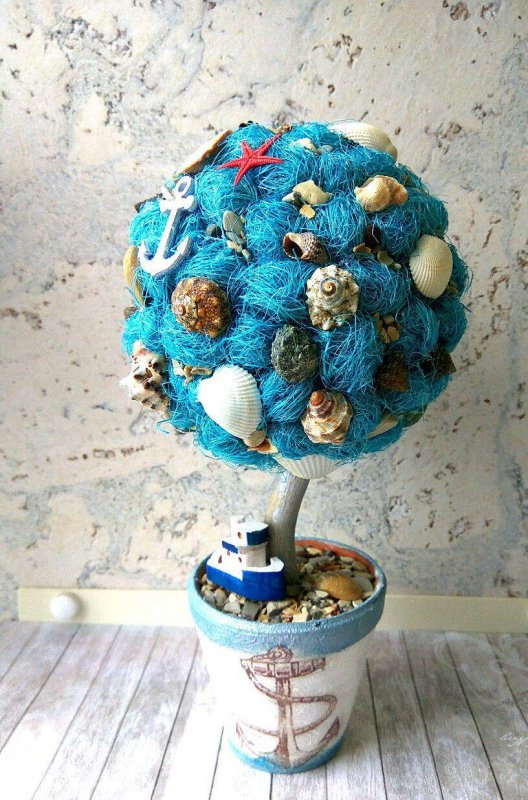 Морское деревце счастья можно изготовить из привезенных с моря материалов: камешков, ракушек, высушенных крабов и жемчужин. Ими следует оклеить основу для кроны топиария. Если ракушек и камешков немного, пространство между ними можно украсить сизалем, искусственными морскими звездами и поделками из соленого теста на морскую тематику. Выполняя ствол топиария лучше взять палочки для суши, украшенные атласными лентами белого, синего или песочного цвета. В качестве подставки для деревца счастья следует взять белый цветочный горшок, который можно украсить искусственным жемчугом, кружевами и небольшими фигурками из соленого теста. Внутри этот горшочек нужно залить алебастром и вставить в эту алебастровую смесь ствол топиария. Поверх застывшей заливки можно положить волокна сизаля, морские камешки и ракушки.