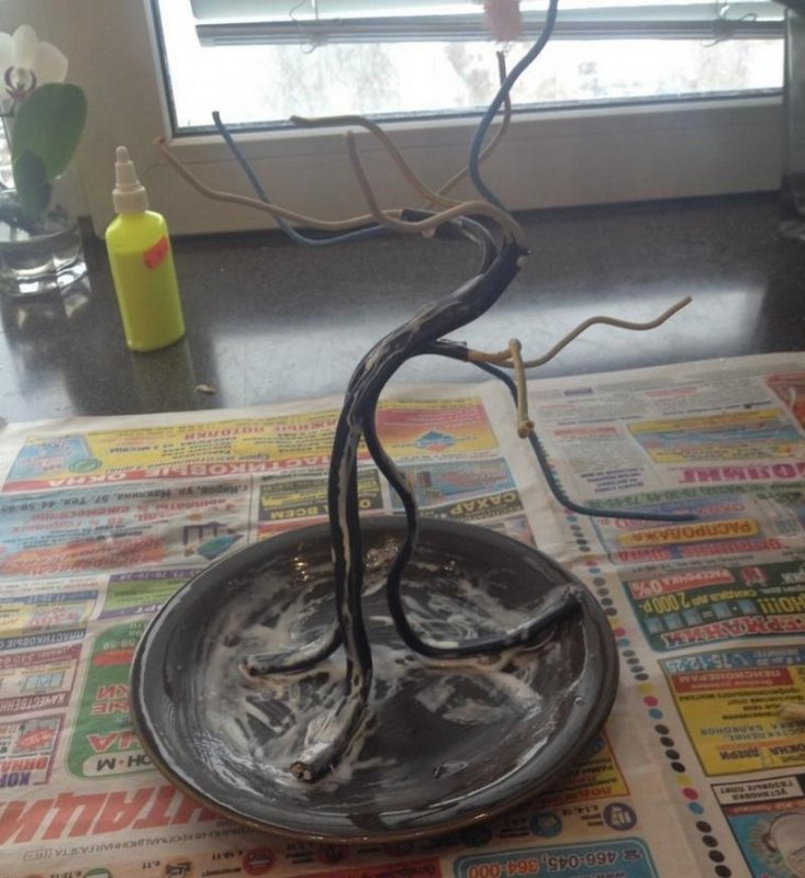 Ствол деревца счастья связывает основу с кроной, поэтому он должен быть прочным и устойчивым. В его роли может выступать обыкновенная проволока, закрепленная художественной лентой, бечевкой или пластиком. Для реалистичности изделия этот ствол можно сделать из деревянной ветки или щепки. Но предварительно эту ветку нужно очистить от коры, покрыть лаком и морилкой. Если делается невысокий топиарий, то в качестве ствола можно взять палочку от эскимо, скрепленные между собой палочки для суши или деревянных шпажек. Цвет и тип ствола зависит от материала основы и кроны. Для топиария с кофейными зернами подойдет белый или коричневый цвет. Изогнутый ствол для европейского деревца можно сделать только из проволоки. Также можно взять любой материал, примерно подходящий для ствола топиария, оформить его и залить гипсом.