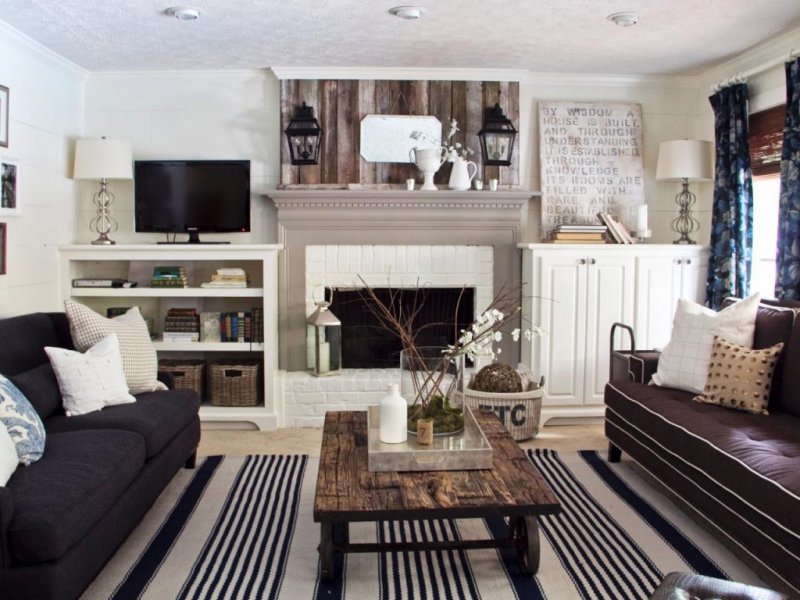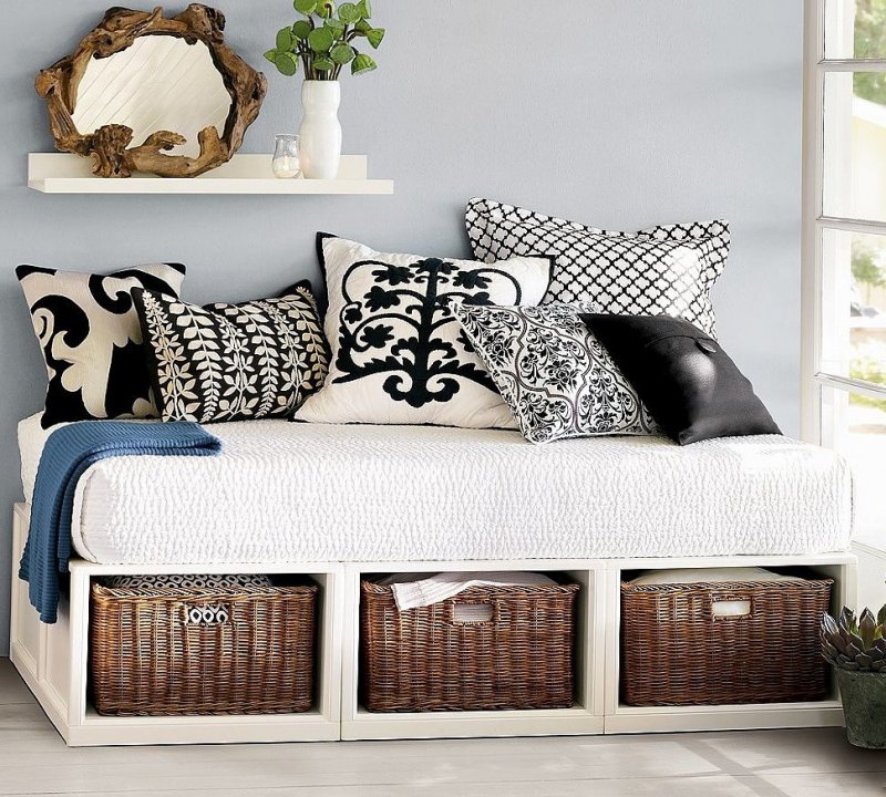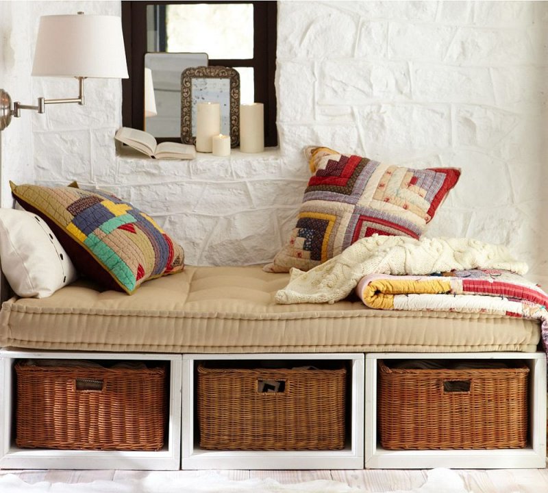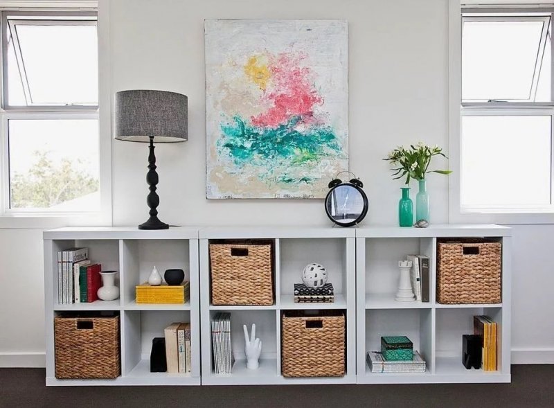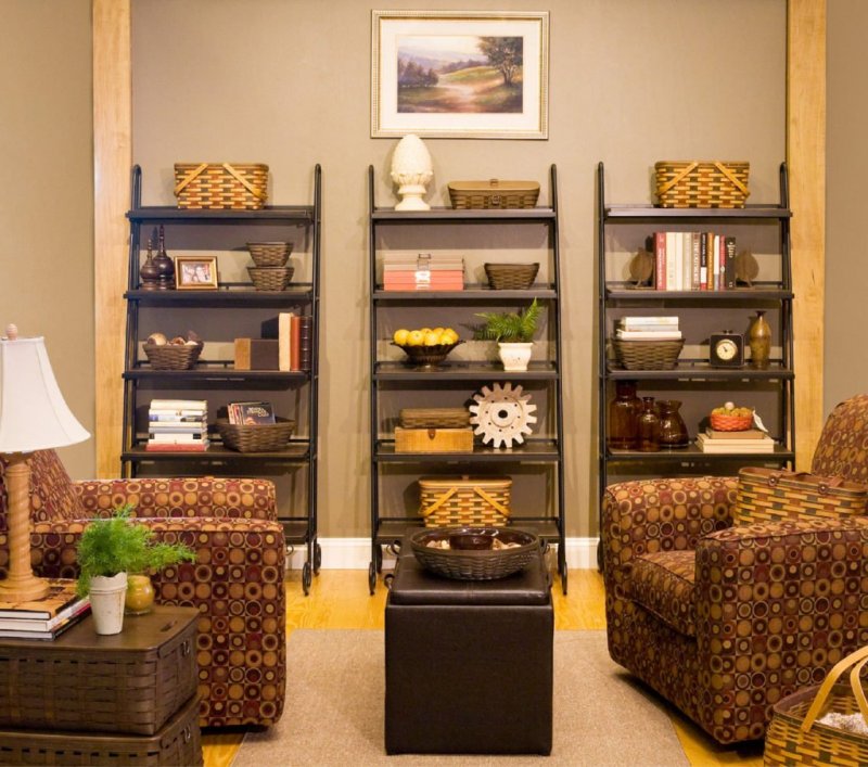 Большая, громоздкая корзина с крышкой в гостиной заменит журнальный столик. Украшения, плетенные из лозы или бересты, в художественном беспорядке размещаются в комнате. Поставленная возле кресла корзинка послужит для хранения сложенного пледа, лишних подушек или недочитанной книги. В тару прямоугольной формы, которая красуется рядом с нишей под телевизор, складывают диски. Нарды, шахматы, монополию и прочие настольные игры, доставаемые только при больших компаниях, тоже складывают в корзину, которую ставят в уголке. Стильным решением станет стеллаж, открытые полки которого чередуются с плетеными ящичками. Расположенные в шахматном порядке, они могут перекликаться с рисунком на паркете, обоях или ковре.