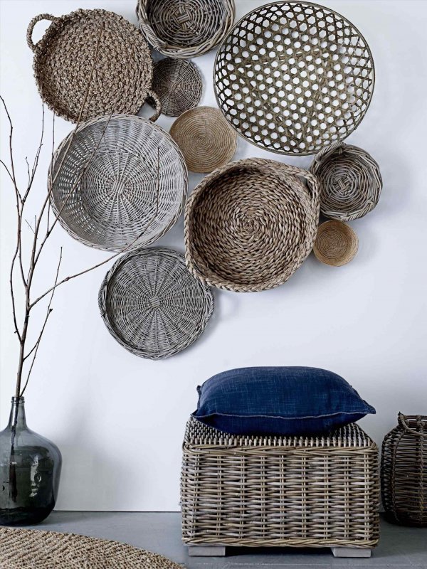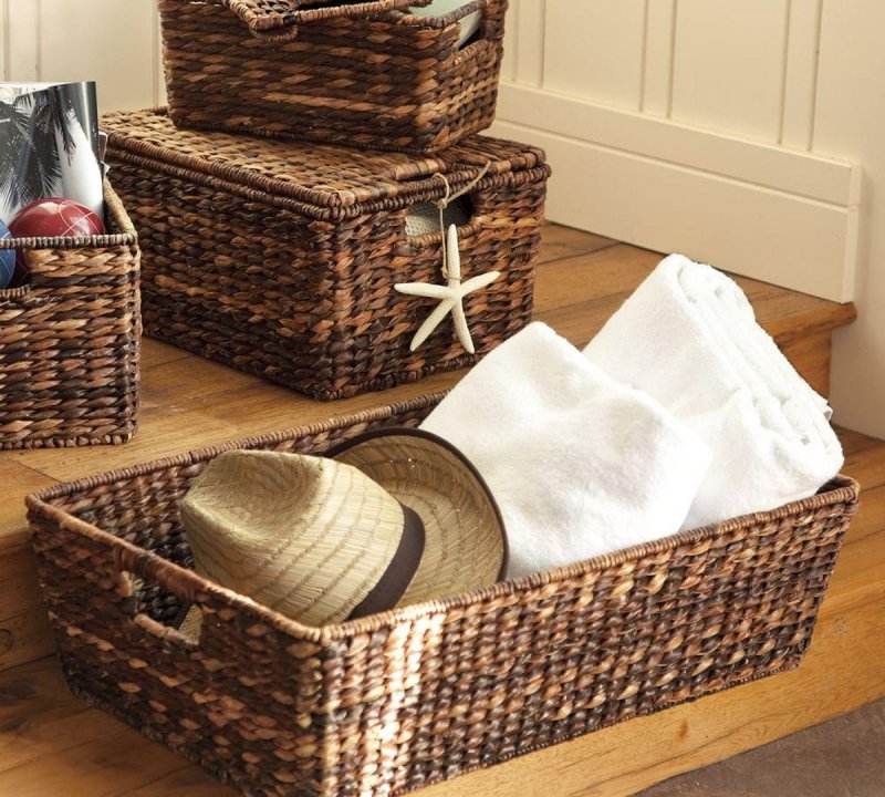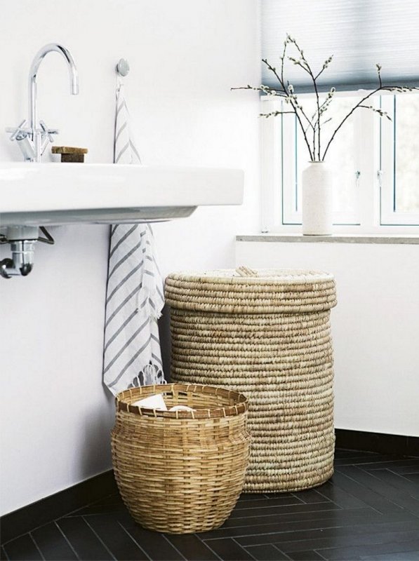 Корзины стали изготавливать еще в древности, когда появились первые техники плетения из подручных материалов (преимущественно лозы). Их дополняли ручками или специальными лямками для переноса на спине. Изначально емкости заменяли современные пакеты и сумки, в которые обычно складывают продукты или мелкие вещи. Маленькие корзинки называли лукошками. С ними часто ходили в лес за ягодами или грибами. Емкости, которые использовали в качестве домашней утвари, именовались кузовками. Сейчас плетеные корзины в интерьере применяются преимущественно для украшения комнаты. Они одновременно выполняют и декоративную, и практическую функции, так как становятся еще и дополнительной системой хранения. Поговорим о том, с какими стилями сочетаются корзины и из каких материалов их изготавливают. Содержание Все о корзинах Варианты использования корзин в интерьере В прихожей В гостиной В спальне В детской В кухне В ванной Советы по уходу за корзинами Интерьерная корзина своими руками Заключение Все о корзинах Классифицируют корзинки по материалу и технологии изготовления, размеру, форме. Также они могут быть закрытыми (иметь крышки) или открытыми. Что касается материала, то в основном используют следующие разновидности: Береста. Верхний слой березовой коры очищают и нарезают на тонкие, широкие полоски. Из них получаются крепкие, но легкие корзины и коробы. В последних раньше переносили дрова и иное тяжелое содержимое. Такой элемент идеально впишется в этнический русский интерьер. В комплекте с бревенчатыми стенами сруба, домоткаными дорожками, глиняными «глэчиками», массивными сундуками и вышитыми подушками корзинки помогут приблизить обстановку к аутентичной. Прутья ивы. Материал использовался повсеместно для изготовления плетеной мебели, заборов и емкостей. Темная ивовая лоза, как и виноградная, обладает гибкостью и прочностью. Корзины из нее прослужат долго. Как правило, изделия имеют большие габариты и служат для переноски увесистого содержимого. Рафии. Материал представляет собой плотную, «пушистую» веревку из натуральных волокон, которые добывают из листьев одноименной пальмы. Корзины получаются мягкими, легко складываются. Неплохо подобный вариант смотрится в африканском этническом стиле. Водяной гиацинт. Корзинки из этого материала изготавливают по особой технологии. Поверхность изделия имеет специфический узор, который напоминает набор лицевых петель, вязанных на спицах. Оригинальный декор сочетается с провансом, скандинавским стилем, кантри. Ротанг. Обработанные стебли тропической лианы (каламуса) для отечественного рынка так и остались экзотикой. Из прутьев плетут прочные корзины со сплошными стенками без традиционных для русского стиля «зазоров» и изящных переплетений. Высокие, слегка расширяющиеся кверху емкости считаются необходимым интерьерным элементом в африканском стиле и ряде этнических направлений родом из стран Латинской Америки. Бамбук. Корзины из материала легкие и изящные. При изготовлении редко прибегают к сложному плетению. Набор бамбуковых полосок обычно просто сшивают белой нитью. Идеален подобный вариант для минимализма и японского стиля. Джут. Материал обычно используют для изготовления мешковины или канатов. Натуральные волокна имеют приятный белесый оттенок. Мягкие, податливые ко