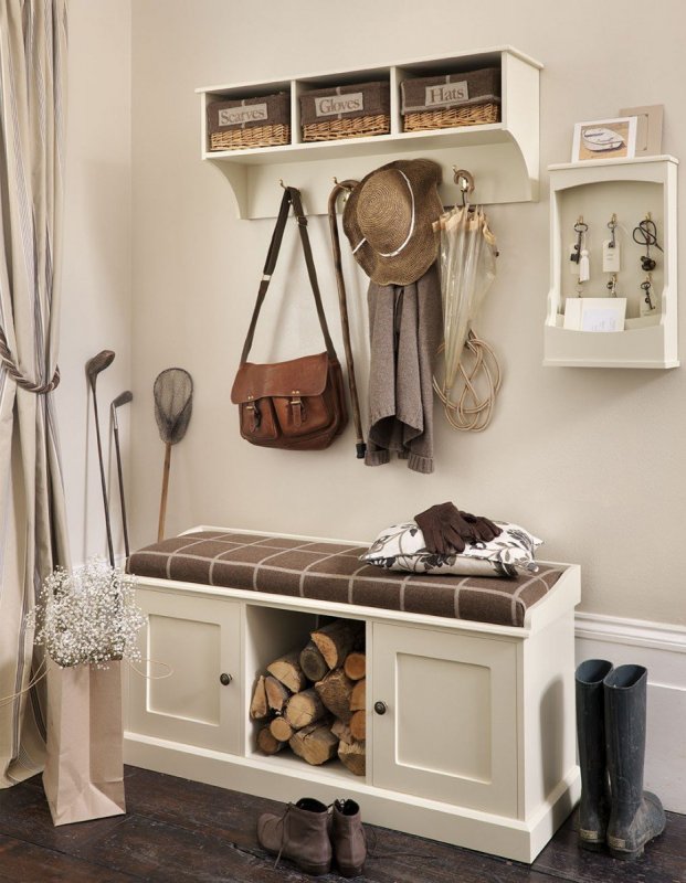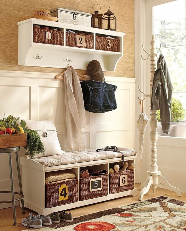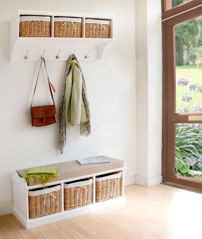 В прихожей корзины можно поставить на пол под скамеечку для переобувания или же закрепить на стене, на манер подвесных полок. В плетеной таре хранят обувь, принадлежности для ухода за ней (губки, щетки, кремы), мелкие предметы возле зеркала (расчески, ключи, бумажники) или же зонтики и трости (если использовать высокую корзинку). На мебельном рынке в последнее время появились оригинальные комплекты. В них вместо традиционных выдвижных ящиков используются корзины с боковыми ручками. Мебель действительно смотрится уютно, аккуратно и слегка по-деревенски. Подобным комплектом можно заменить традиционную «прихожую», состоящую из набора нижних и верхних полок, между которыми располагается скамейка и крючки для одежды.