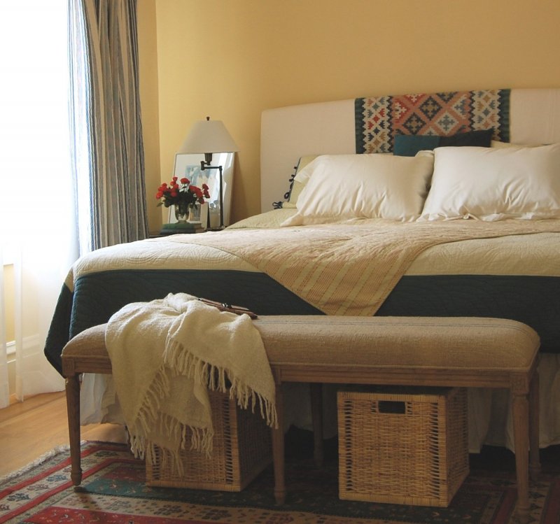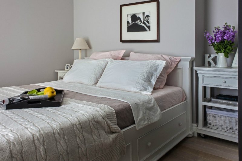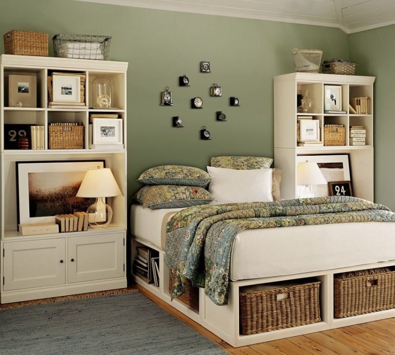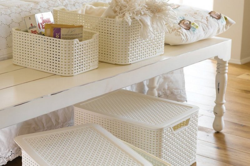 В спальне корзины используются в основном для хранения постельного белья. Большие плетенки либо прячут в шкаф, стеллаж, под подиум, на котором стоит кровать, либо ставят возле постели, в углу, на видном месте. В спальне в стиле прованс крупная тара будет гармонировать со светлой отделкой и обилием древесины. Миниатюрные корзиночки используют для хранения мелочей: украшений, расчесок, косметики. Их размещают на столешнице комода, трюмо, прикроватной тумбочки.