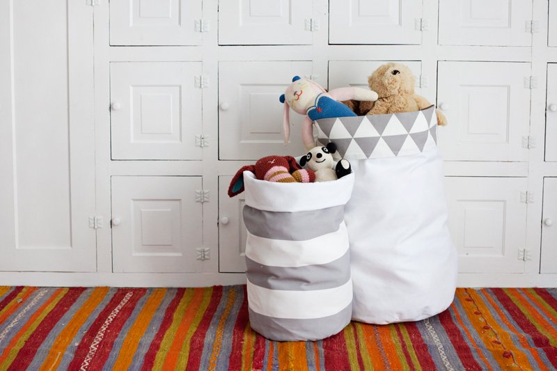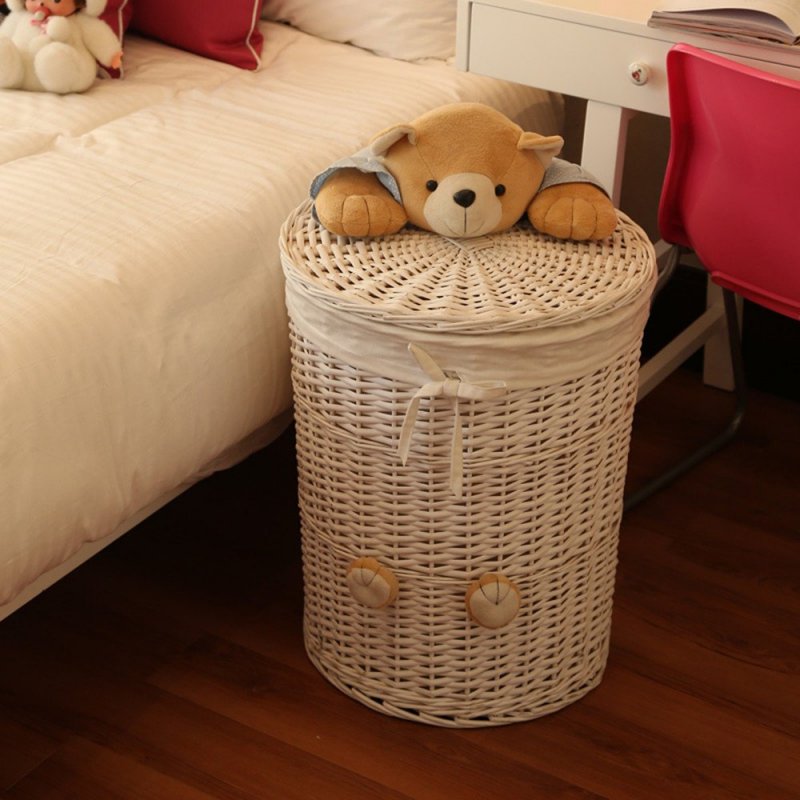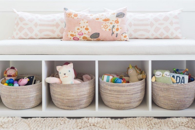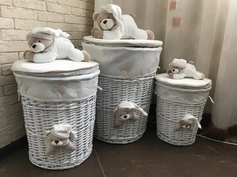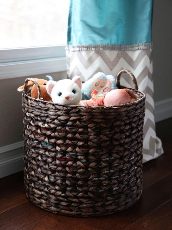 В детской комнате корзины станут заменой традиционным пластиковым ящикам. Для емкостей покупают отдельный стеллаж, в котором все они компактно разместятся. В корзинки складывают игрушки, книжки, вещи. Для последних целей все же рекомендуют приобрести тару, изготовленную из натурального материала. Если детская комната не может похвастаться площадью, то корзинки прячут под кроватью.