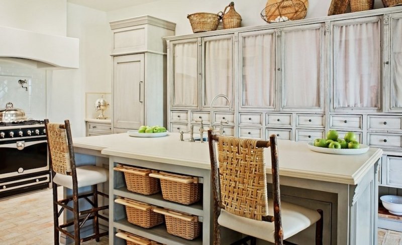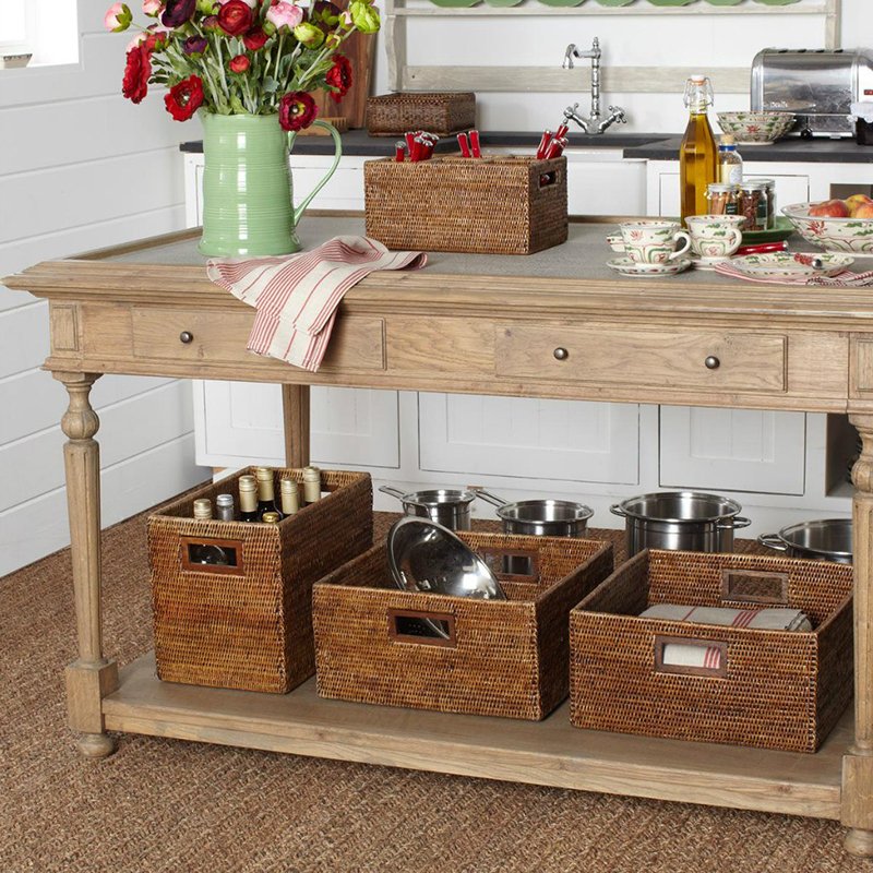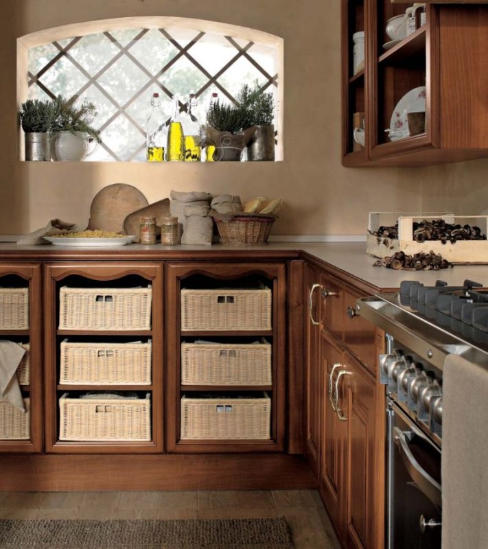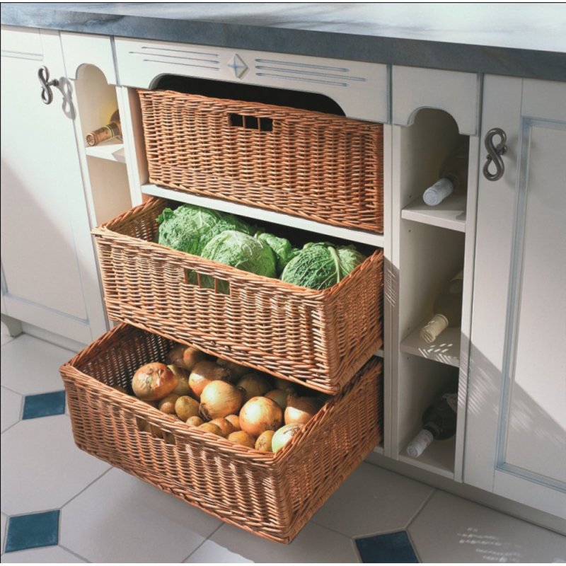 Изначально корзины только на кухне и использовались. Их приспосабливают для хранения овощей, которые спокойно обходятся без холодильника (лук, картофель, морковь, свёкла), бутылок с вином, бокалов, стаканов, прочей посуды, полотенец и прихваток. Удобнее всего использовать такую тару вместо выдвижного ящика: и смотрится красиво, и места занимает мало. Более компактные и изящные корзинки ставят на стол: в них складывают салфетки, фрукты, специи в баночках. Удобна плетеная тара и для пикников. Собрать снедь для отдыха можно сразу же на кухне, положив ее в корзинку и украсив расшитой или клетчатой салфеткой.