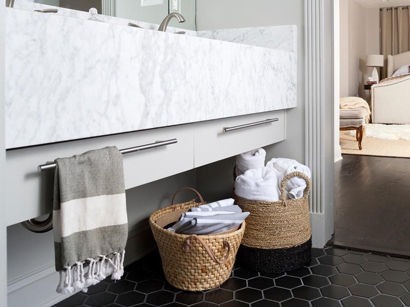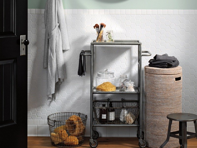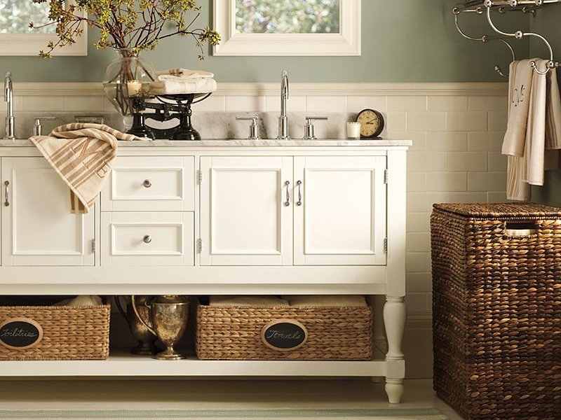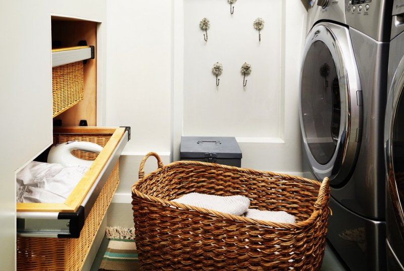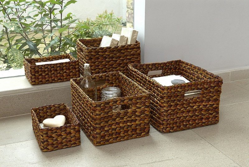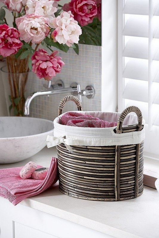 Для ванной комнаты все же рекомендуют использовать тару, изготовленную из полосок пластика. Она прослужит долго, не испортится от повышенной влажности, ее легко помыть. Как правило, в роли главной корзины ванной выступает тара для грязного белья. Однако чистые полотенца, бытовую химию и прочие нужные мелочи тоже придется куда-то складывать. На помощь снова придут выдвижные корзинки. Причем их можно сделать широкими или узкими в соответствии с особенностями конфигурации комнаты. На полочке под зеркалом возле раковины хаос из расчесок, ножничек, ватных дисков и палочек легко систематизировать, если купить группу из миниатюрных корзинок с крышечками. В каждую складывают определенный набор инструментов, которые классифицируют по назначению.