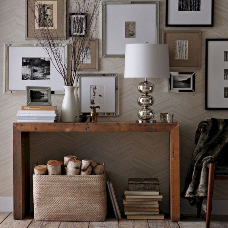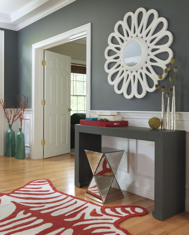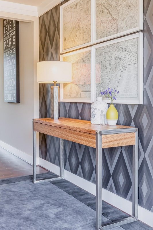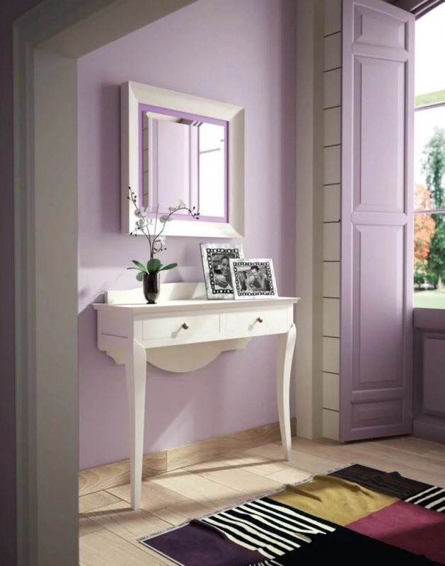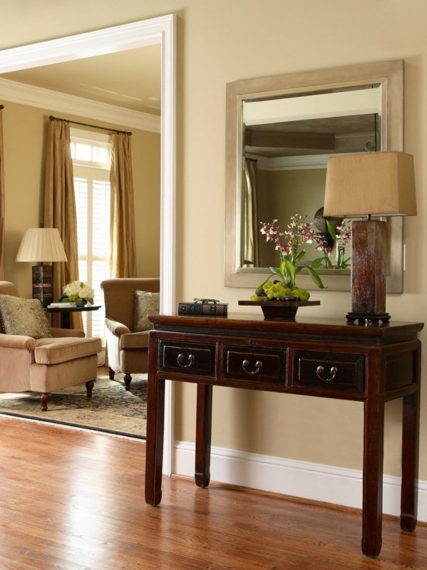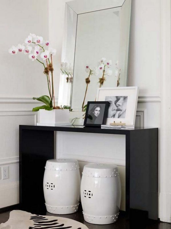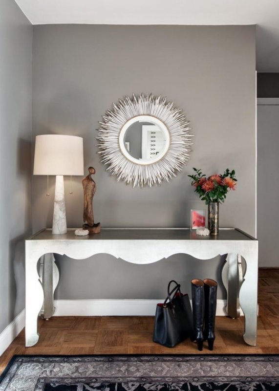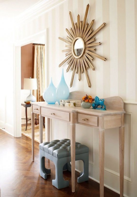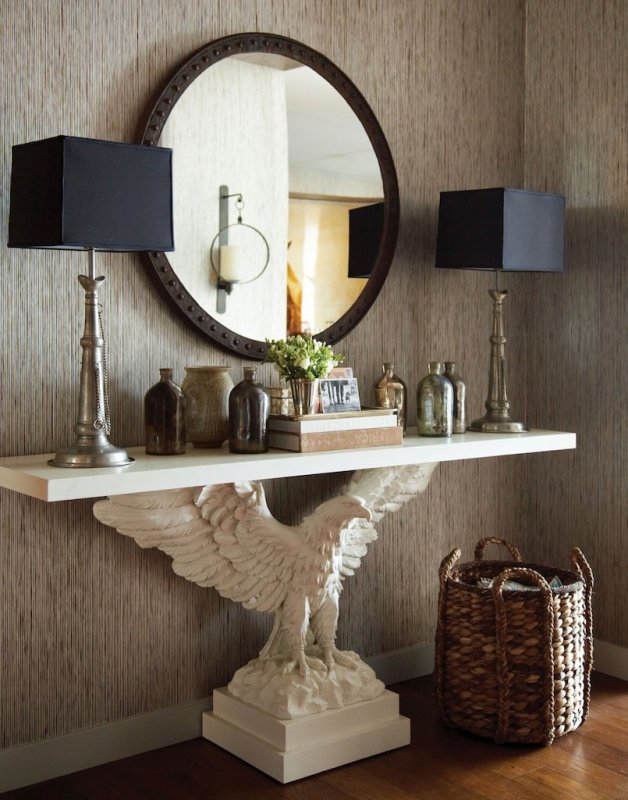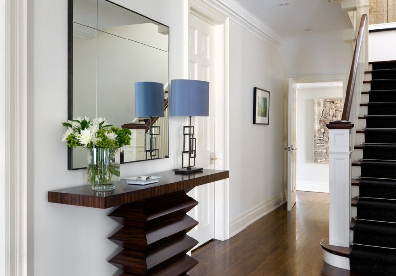 Консоль в коридоре устанавливают около длинной либо короткой стены, в простенке, нише. Под нее ставят мягкие пуфики, коробки с обувью, над подставкой вешают зеркало, ключницу, органайзеры для мелких предметов, крючки для шляп, зонтов. Также конструкция иногда оснащается выдвижными ящичками, в которых складывают перчатки, одежные щетки, обувные кремы и др. Большое зеркало «во всю стену» делают позади прозрачной подставки, на которой размещают милые сувениры, вазочки с сухими букетами.