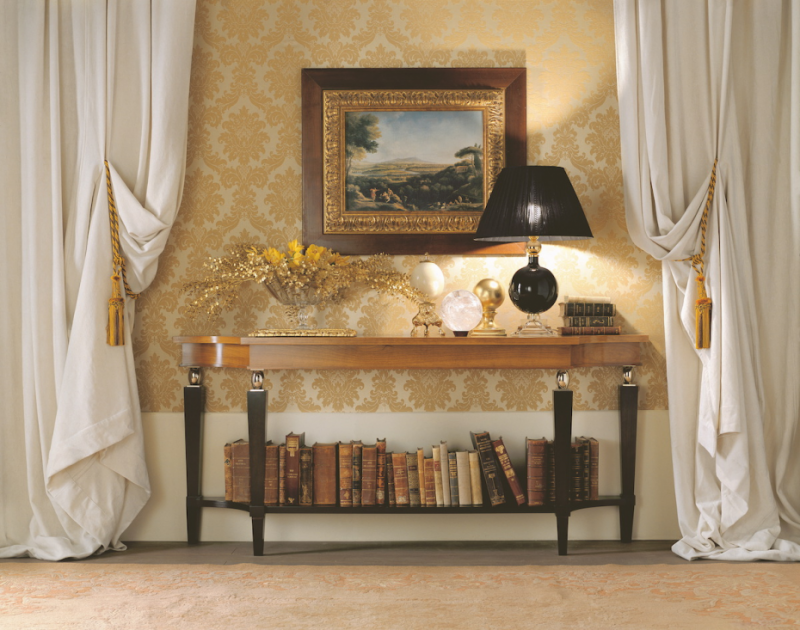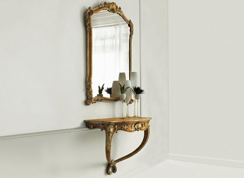 Если закрепить настоящую консоль невозможно, создают ее качественную имитацию – на стену вешают полку, а снизу подрисовывают ножки или приклеивают подходящие молдинги.