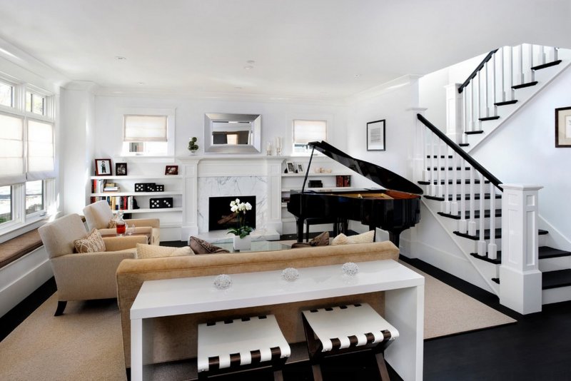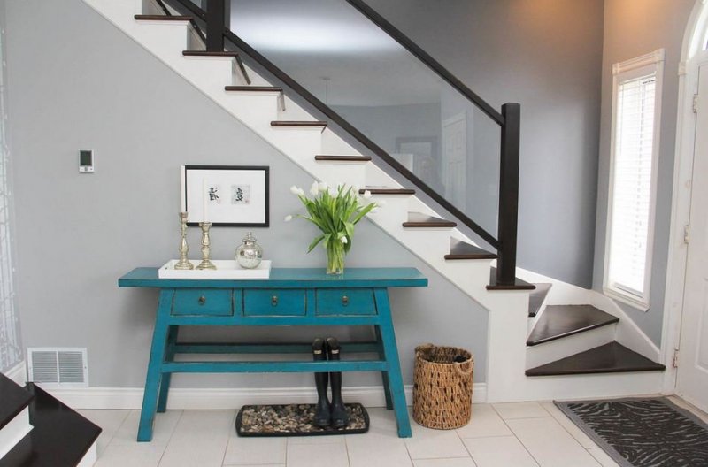 В двухэтажных квартирах декоративную консоль размещают под лестницей – там часто имеется много свободного места.