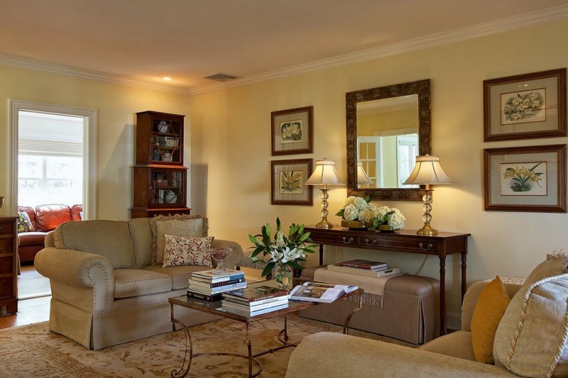Наиболее распространенное место расположения консольной конструкции в гостиной – под телевизором, напротив столовой зоны, места отдыха. Когда в помещении очень узкий подоконник, консоль размещают у окна, оригинально украшая это место или маскируя радиаторы отопления. Сверху на нее ставят растения в вазонах, коллекцию керамических свистулек, серию фотографий, при необходимости – комнатный вентилятор.