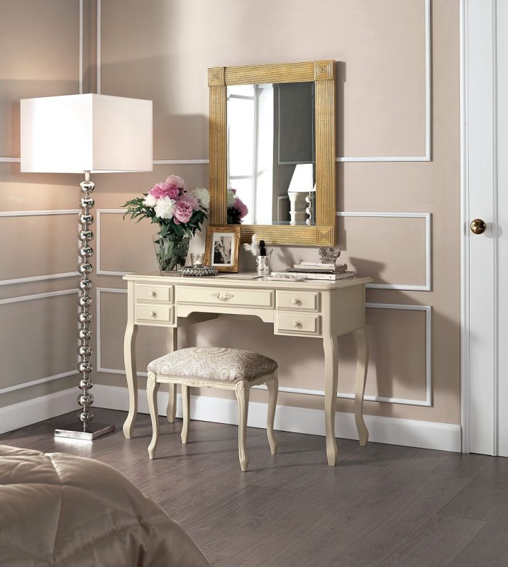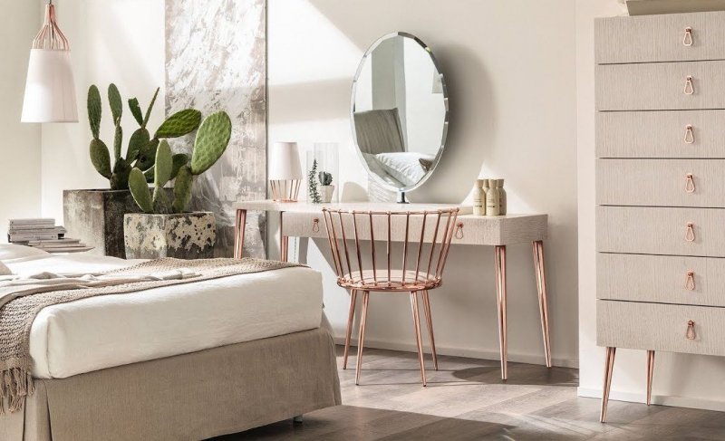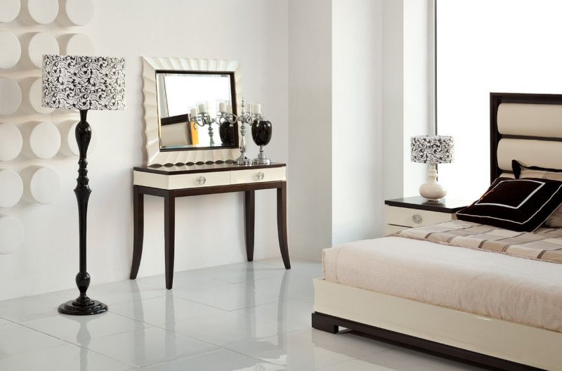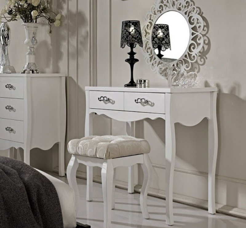 Здесь конструкцию ставят рядом со шкафом, кроватью или окном. В просторной спальне размещают две небольшие консоли с разных сторон кровати, на них ставят прикроватные светильники, в том числе ночники. Наиболее популярный вариант – использование в качестве компактного туалетного столика: тогда в нем обязательно делается несколько ящичков, а сверху вешают большое зеркало. Реже за столиком-консолью сидят с ноутбуком, составляют список дел, покупок в блокноте. Высокую, длинную конструкцию с колесиками закатывают поверх кровати, используя в качестве столика для завтрака, ужина, декоративный элемент оформляют мягкими игрушками, разными детскими поделками.