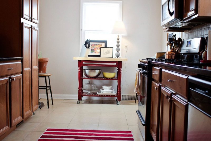 Консоль станет практичной деталью кухонного помещения, если разместить на ней банки с крупой, коробочки со специями. Сюда же иногда ставят солонку, сахарницу, салфетницу, графин с фильтрованной водой для питья. В тесной кухоньке конструкция играет роль миниатюрного буфета или барной стойки, при необходимости, раскладывающейся в настоящий обеденный стол. Декоративную оформляют узкой скатертью или рушником, украшают коллекцией сувенирных бутылок от дорогих напитков, дизайнерских упаковок для чая.