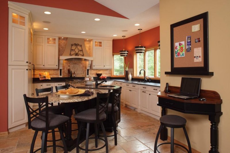 Часто используется несколько материалов одновременно – дерево для столешницы и кованые ножки, каменный низ со стеклянным верхом, МДФ с декоративными элементами из камня, древесины.