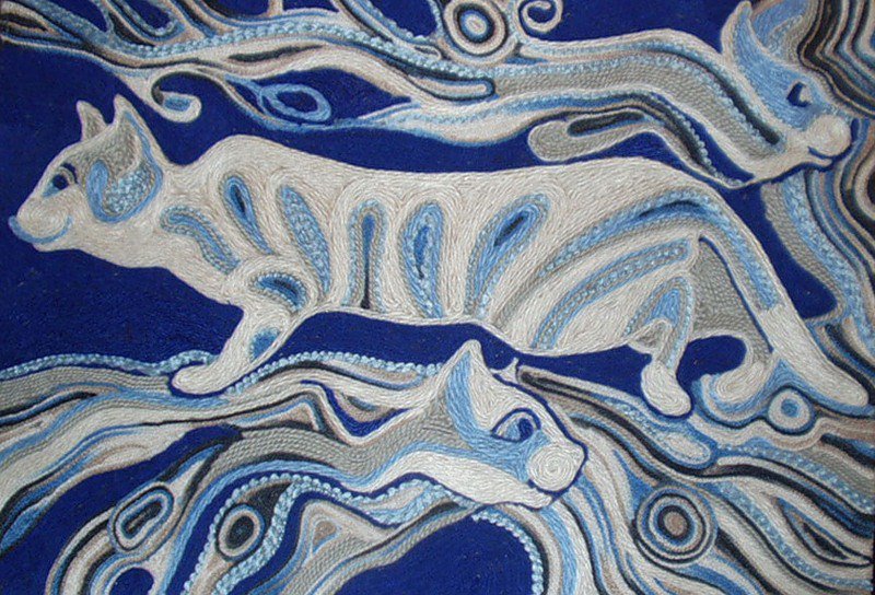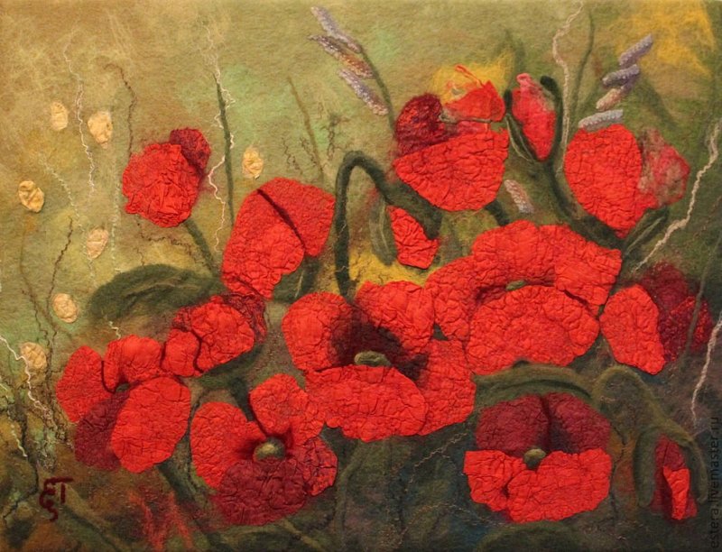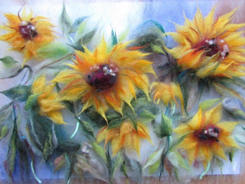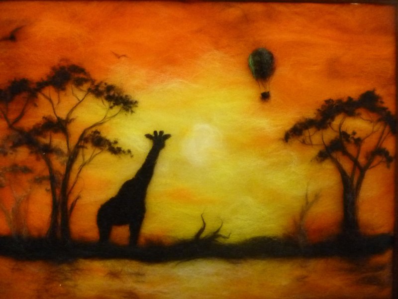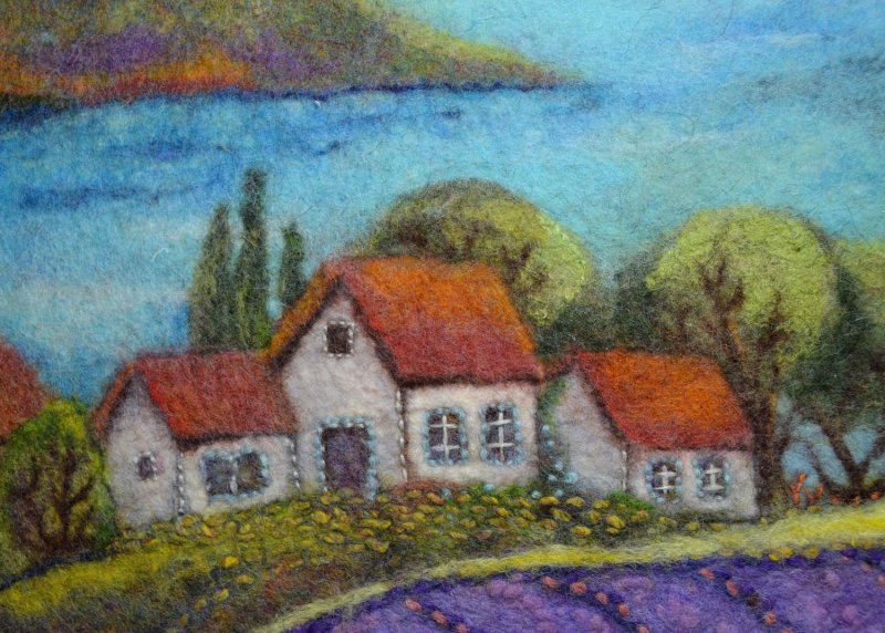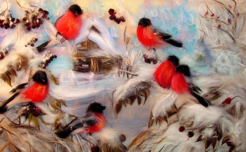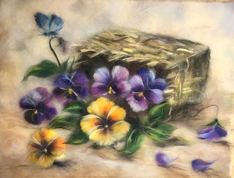 Для работы с шерстью понадобится специальная игла для валяния. Сначала на полотно наносят эскиз изображения. Его постепенно заполняют клочками шерсти разных цветов, которые затем спутывают и уплотняют с помощью иглы.