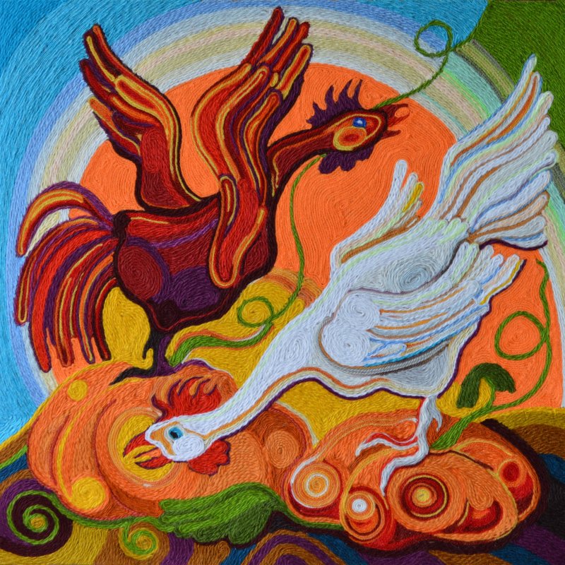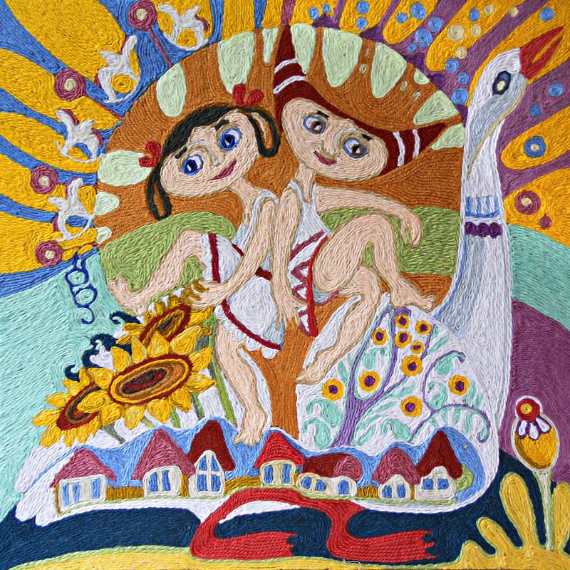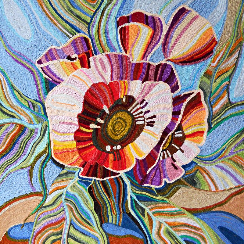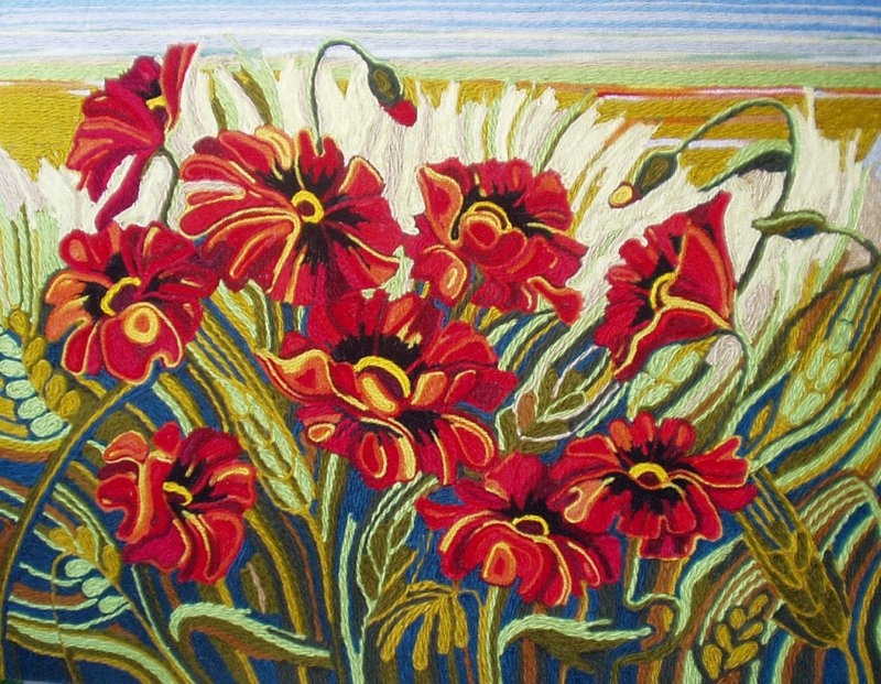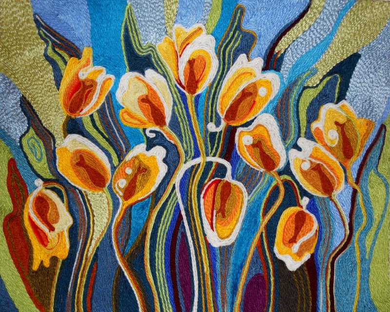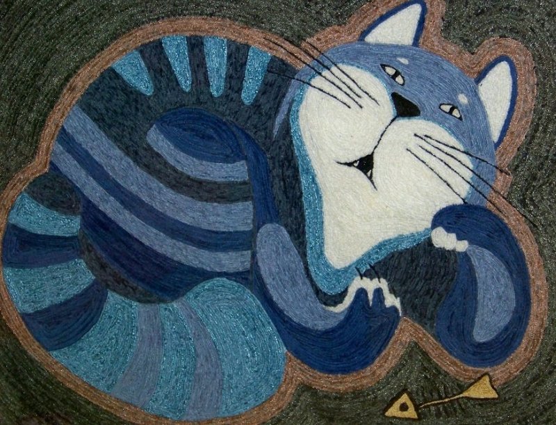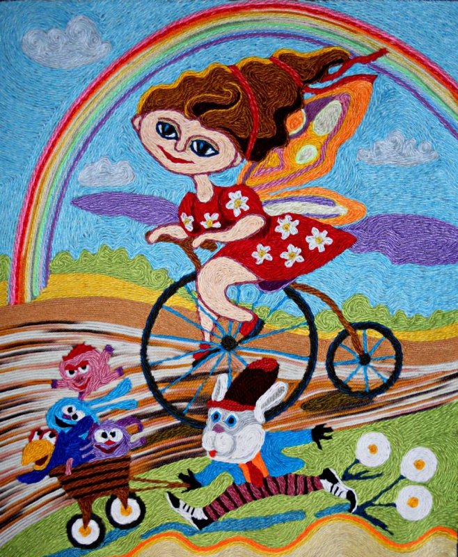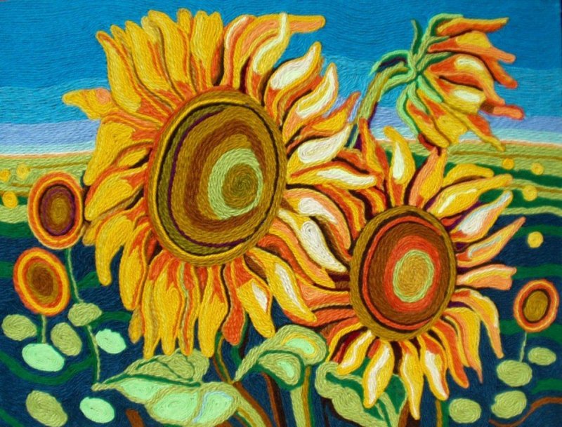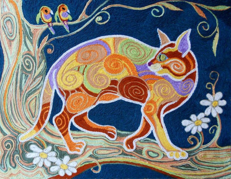 Один из простых, но трудоемких вариантов рисования нитями — флокирование. Для работы в этой технике понадобится клей ПВА, бумажная основа, ножницы и разноцветная пряжа. Сначала эскиз изображения переносят на картон. Затем пряжу разрезают на мелкие кусочки. Отдельные фрагменты рисунка промазывают клеем ПВА и присыпают их измельченными нитями. Работа чем-то похожа на создание картин из песка, вместо которого используют пряжу. В результате получается интересный, красивый декор, которым можно украсить любую комнату.