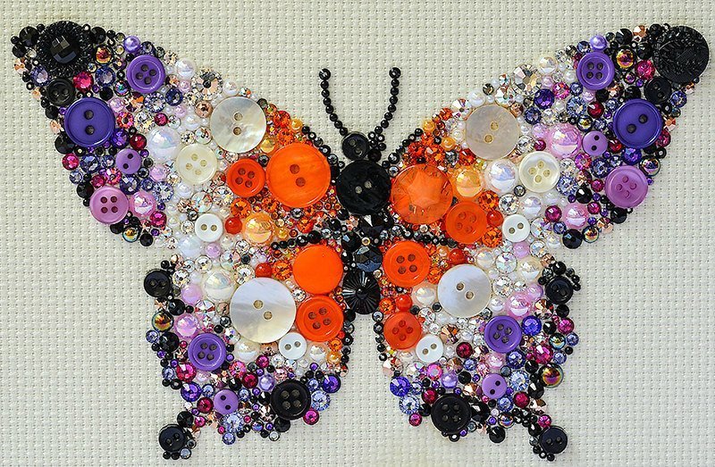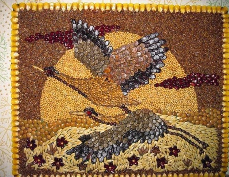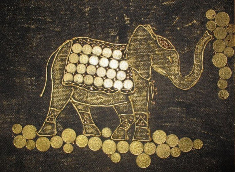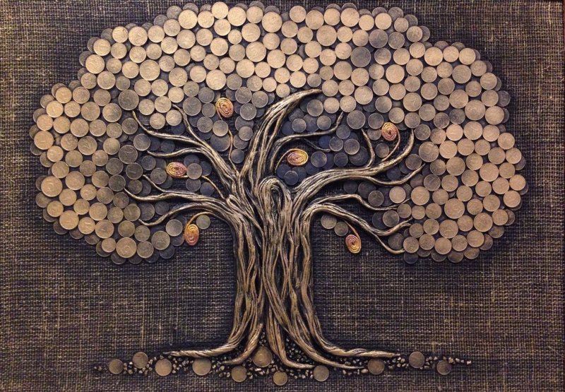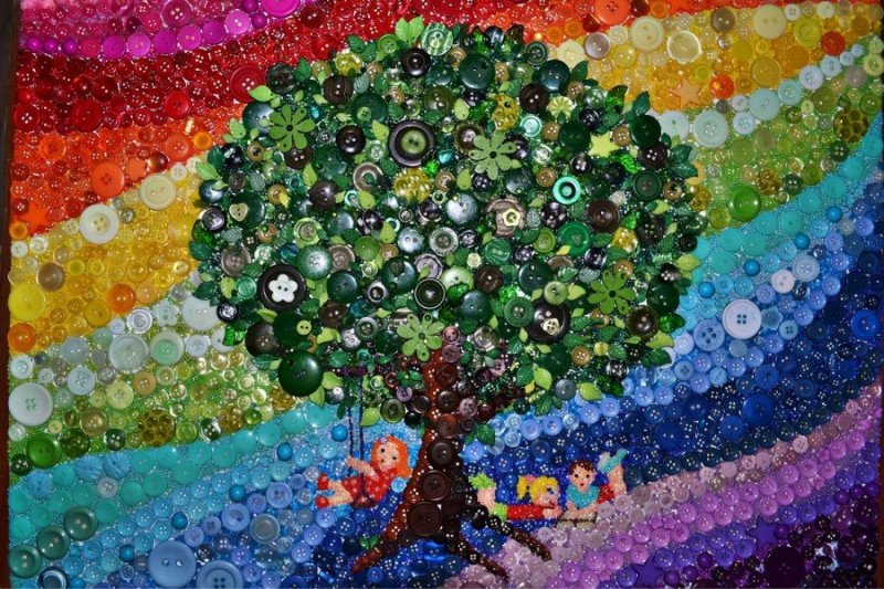 Пуговицами и монетками обычно заполняют только акцентные области картины. К примеру, фон рисуют красками и кистью, а букет цветов делают объемным, выпуклым. Пуговицы закрепляют с помощью ниток, а монетки приклеивают или цепляют за колечки, которые продевают в предварительно просверленные дырочки. Часто эти материалы комбинируют с лентами, бусинами и стеклярусом. Если картина будет полностью заполнена пуговицами, то их нужно тщательно подбирать по цветам. Бисером вышивают на ткани. Для работы используют пяльцы, иголку и леску. Это такой же кропотливый труд, как и вышивка нитками. На создание небольшого полотна придется потратить много времени. Однако переливающийся на свету рисунок станет для мастера достойной наградой. По схожей технике выполняют «алмазную» вышивку. Только камушки не пришивают, а приклеивают к липкой основе, на которую уже нанесен рисунок. Кстати, для начинающих продаются специальные ткани с эскизами, чтобы проще было вышивать бисером. Монетками на изображении декорируют преимущественно пышные кроны деревьев и рыбью чешую.