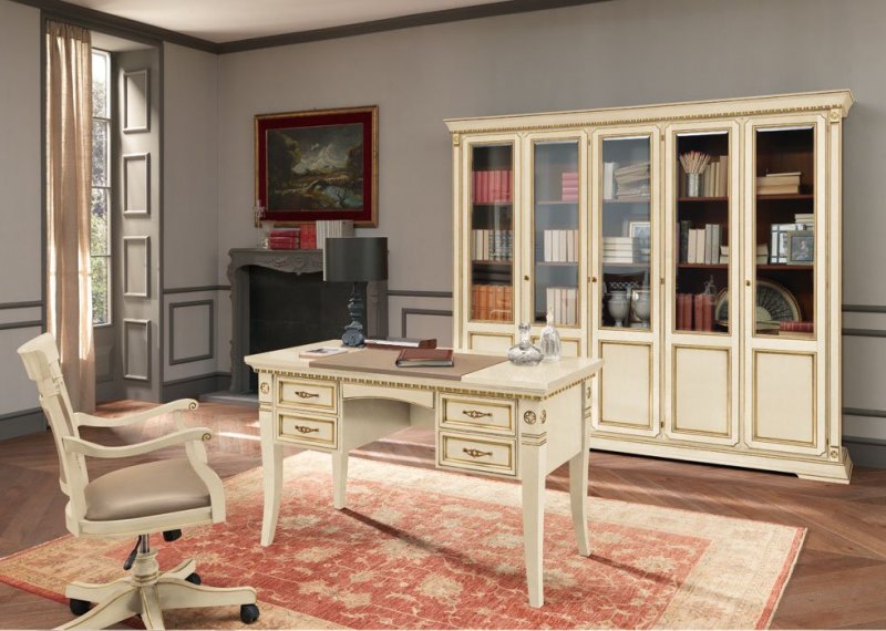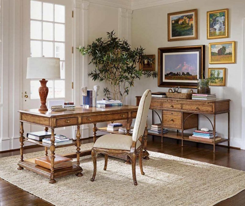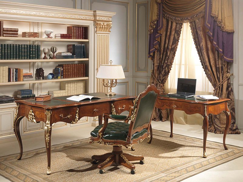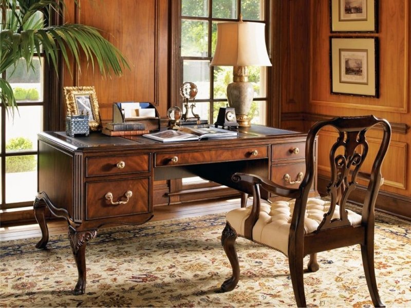 Для классического интерьера подойдет резной стол из натурального дерева в темных тонах. Столешница может быть обтянута бархатом или кожей, а ручки выдвижных ящиков покрыты позолотой. Имиджевые аксессуары добавят композиции благородства. Здесь будут уместны антикварные письменные приборы с подставкой из дорогих древесных пород или мрамора, чернильницы, пресс-папье, ежедневник в кожаном переплете, нож для резки бумаги, старинная настольная лампа.