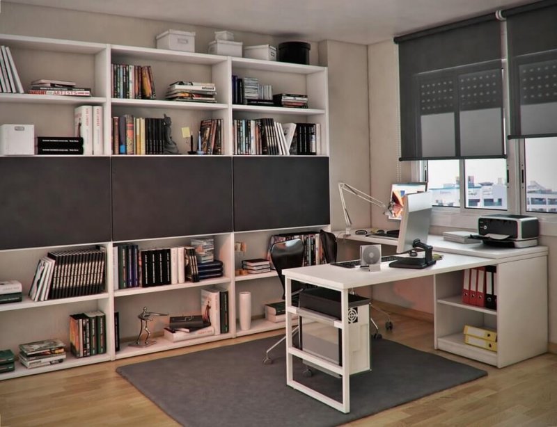 Правильное расположение техники сокращает энергозатраты. Компьютер размещают снизу – на полу или на подставке. Принтер часто устанавливают под столешницей на специальной полке. Но если разместить устройство справа на боковой стенке конструкции, пользоваться им будет значительно удобнее и подручней. Чтобы заправить бумагу, распечатать какой-либо проект или сделать копию, достаточно будет просто повернуться. Кабеля не должны лежать на полу. Их нужно соединить стяжками и закрепить на стене или спрятать под плинтус.