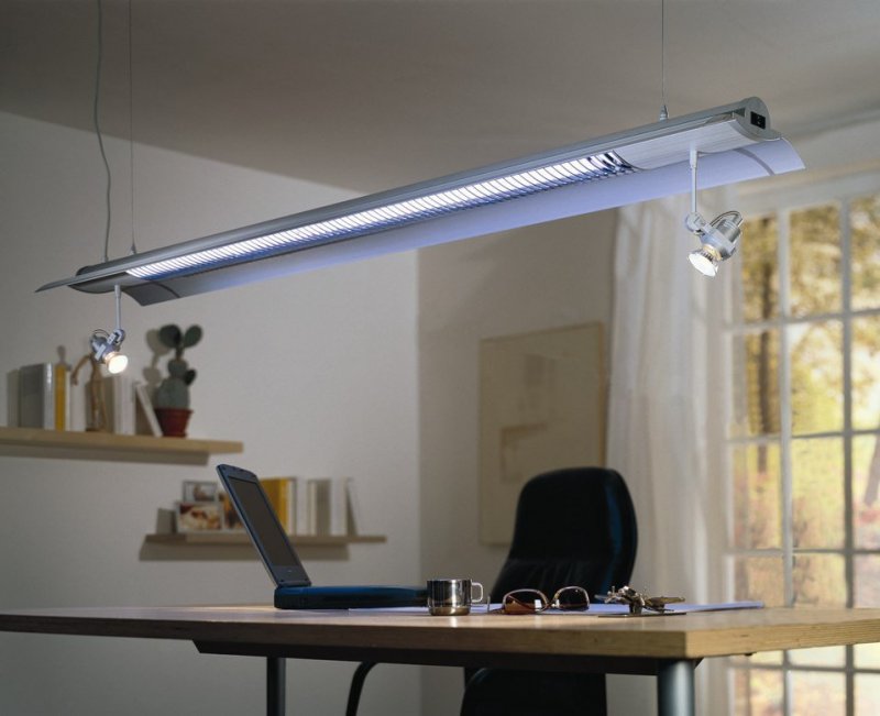 Недостаток света может негативно сказаться на зрении. Поэтому помимо общего верхнего света необходимо использовать рабочее освещение. Это могут быть бра, поворотные споты, настольная лампа. Нежелательно использовать люминесцентные источники, поскольку их постоянное мигание утомляет глаза. Их лучше заменить на экономичные светодиодные лампы. Они не моргают и не напрягают зрение. Это непременное условие при выборе освещения для рабочего места школьников. В ночное время не помешает подсветка. Светодиодная лента, протянутая по периметру, украшает мебель, придает ей эффектный и фантастический вид.