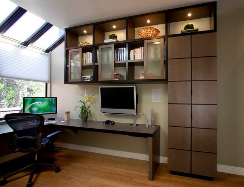 в шкафу – когда дверцы закрыты, невозможно догадаться, что за ними разместилось полноценное рабочее место со всеми положенными компонентами. В качестве столешницы выступает полка. В таком «кабинете» необходимо предусмотреть дополнительное освещение;
