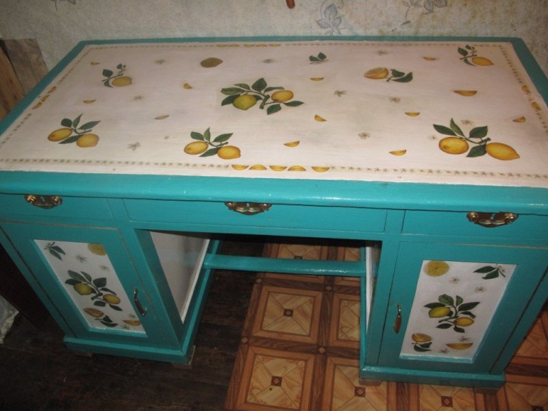 Декупаж – изображение с декупажных карт или салфеток переносится на столешницу и фиксируется при помощи специального клея и лака. Также для этого можно использовать фрагмент обоев, оставшихся после оклейки стен.