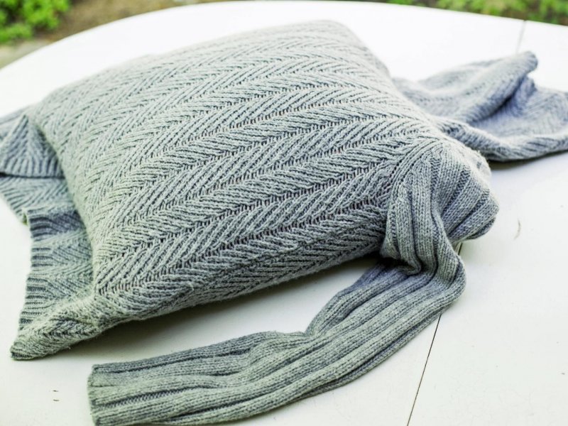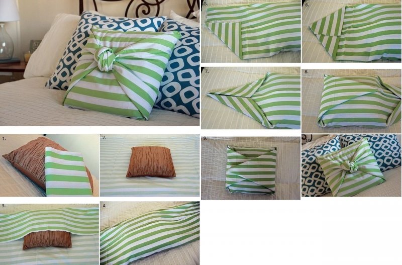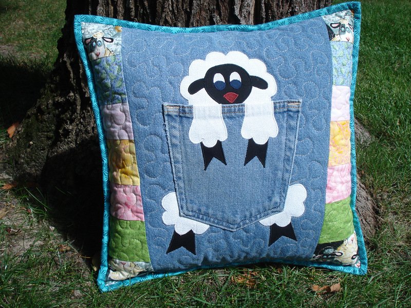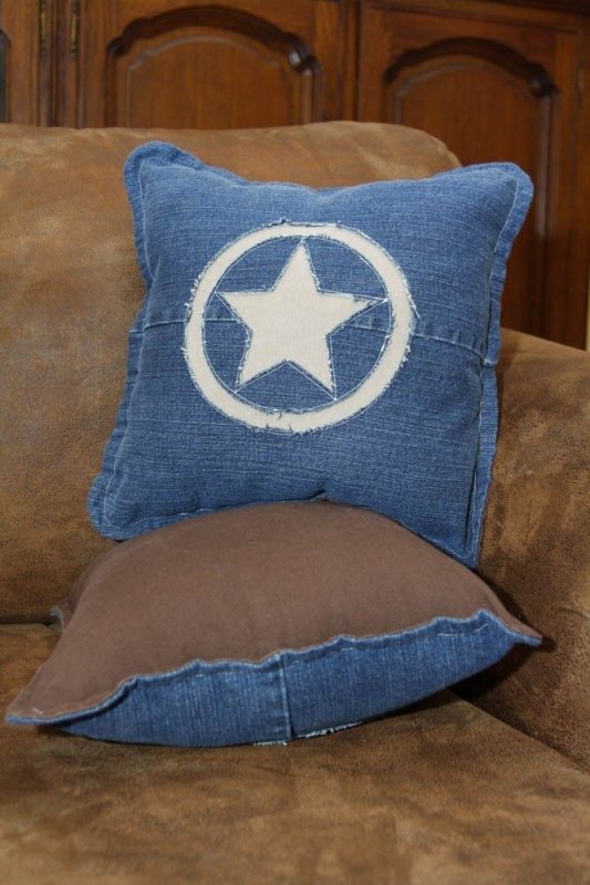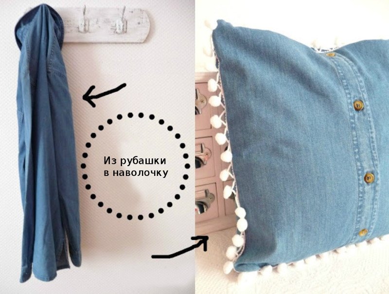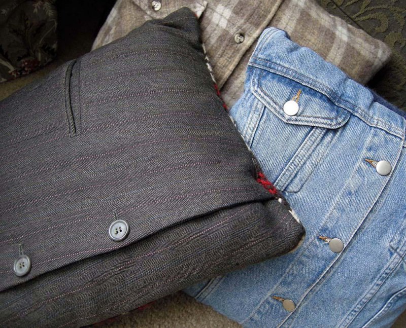 Чудесные наволочки для подушек получаются из старых джинсов, рубашек и свитеров. В двух последних случаях у одежды отрезают рукава и нижнюю часть, оставляя только воротничок и «нагрудный» кусок ткани. Разрезать рубашку или свитер по шву не нужно. Вторая часть станет задней стороной чехла. Затем остатки рубашки сшивают с двух сторон по бокам. К нижней пришивают молнию. Верхнюю часть, на которой воротничок, дополнительно декорируют куском ранее отрезанной снизу ткани, чтобы прикрыть пустую горловину. Эту деталь можно пришить к рубашке сзади и просто разгладить, так как шов на лицевой стороне будет смотреться не очень эстетично. В нагрудный кармашек можно положить платок. Из джинсов сшивают чехлы по такому же принципу, только отрезают обе штанины.
