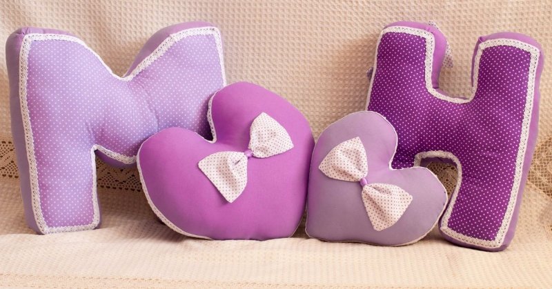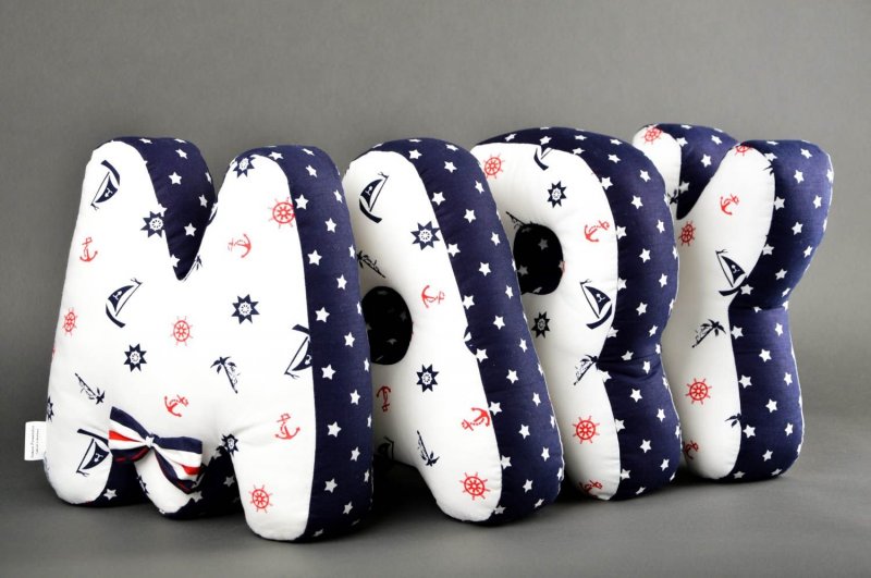 «Алфавитные» подушки изготавливают по тому же принципу, что и изделия в форме животных. Выкройки легко найти в интернете. Такое украшение больше подходит к современным интерьерам гостиных, спален и детских комнат. Последний вариант особенно актуален, так как ребенка с малых лет можно увлекать обучением в форме игры. Маленькие буквы-подушки шьют из фетра. Стильно будут смотреться объемные модели, у которых лицевая сторона и боковины сшиты из материалов разных цветов. Получится своеобразный 3D-эффект.