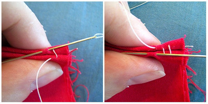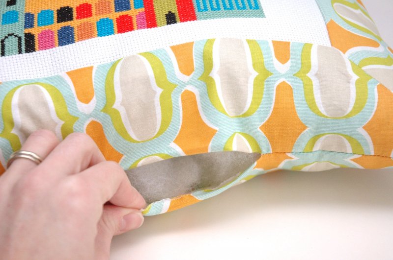 Отверстие для выворачивания, как правило, зашивается потайным швом. Стежки должны быть небольшими, аккуратными. Узелок завязывают изнутри, а иголку вытягивают на лицевую сторону. Края ткани заворачивают, а чехол складывают ровно по машинному шву, который закончился на середине. Это важно, так как несоответствие будет бросаться в глаза. Чтобы строчка смотрелась еще аккуратнее, ее дублируют, но проколы иголки располагаются в шахматном порядке относительно предыдущих. Тогда и шов получится прочнее, и выглядеть он будет опрятнее. Так как подушка не будет выставляться в музее в качестве экспоната и большую часть времени она проведет в наволочке, четвертую сторону «с лица» можно просто прошить машинкой. Главное, чтобы строчка прошла как можно ближе к краю. Если ткань выбрана пестрая, то подобранная по оттенку нитка вообще не будет на ней заметна.