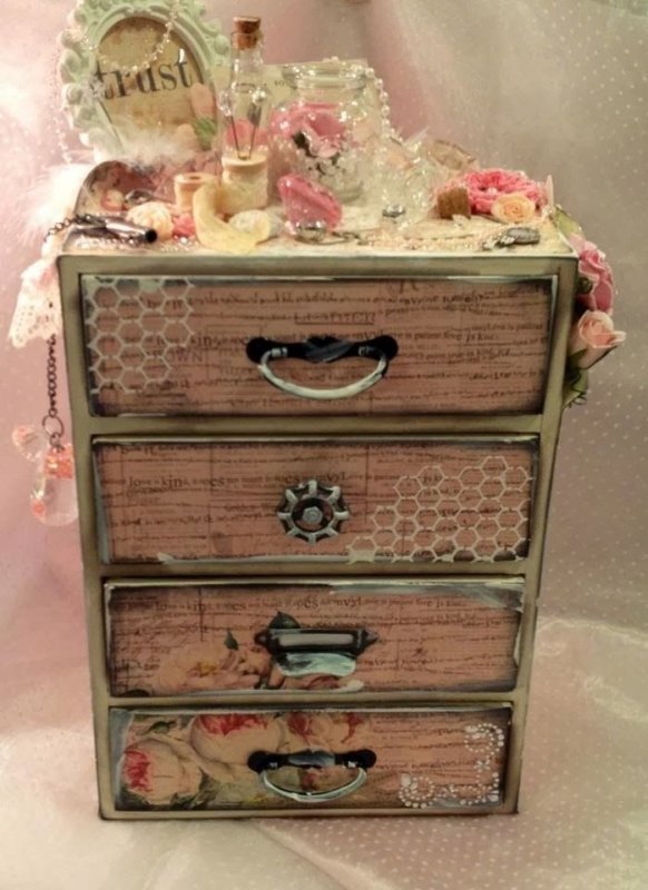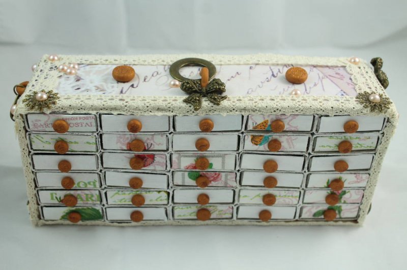 ножками столика или комода станут четыре деревянные бусины в форме конусов, ручками ящичков – круглые бусинки или мелкие пуговки.