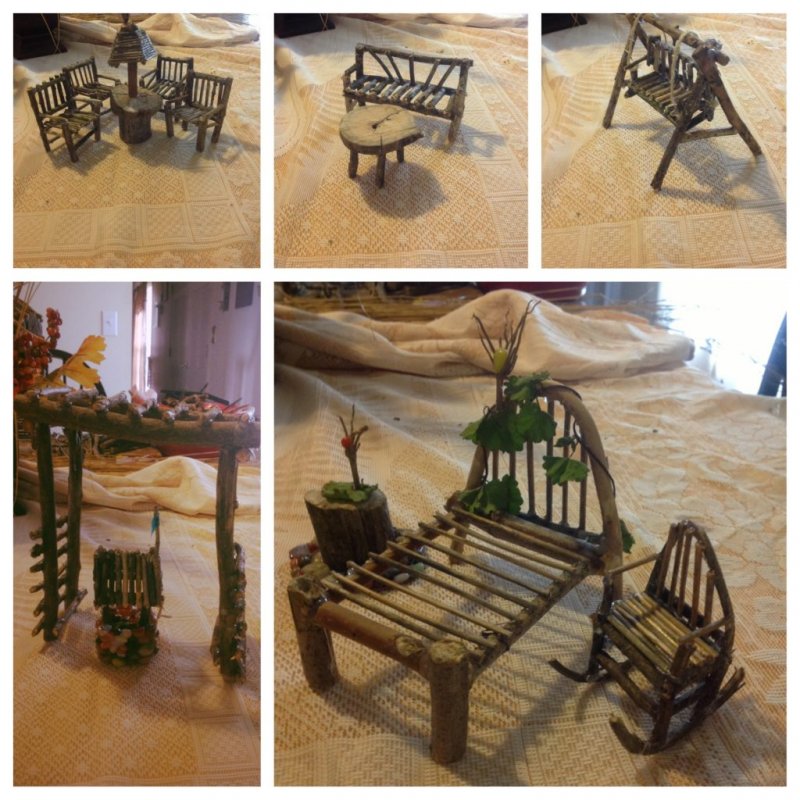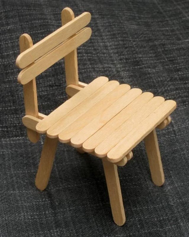 набор деревянных прищепок, предварительно избавленных от металлической соединительной части, поможет создать настоящую садовую мебель, напоминающую украшенную резьбой, для небольшой куклы. Детали крепятся на столярный клей, готовая конструкция окрашивается морилкой или акрилом;