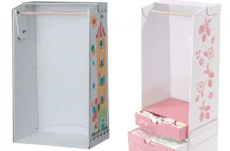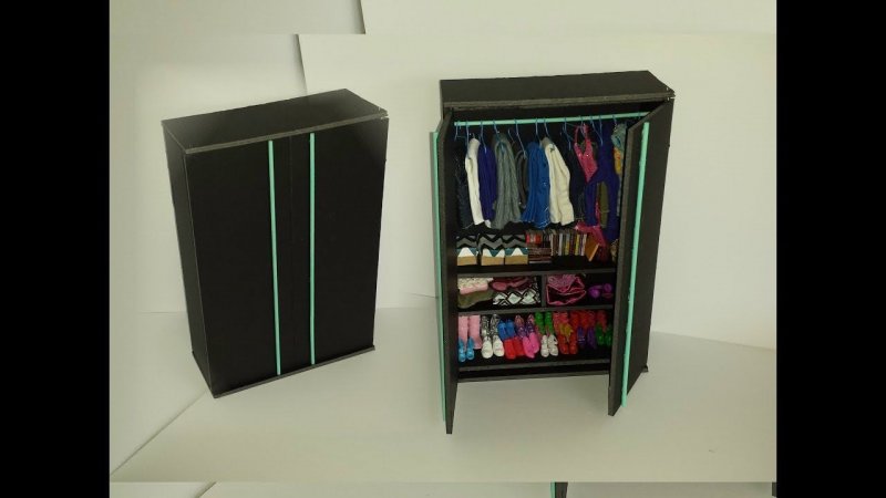 Чтобы сделать из картонных коробок, гофрокартона, шкаф в миниатюре, вначале создают эскиз, решают, из каких деталей будет состоять будущее изделие. Схемы некоторых изделий можно скачать из интернета, распечатать на принтере, после чего перенести на плотный картон. Для изготовления современного шкафчика, в который поместится весь кукольный гардероб, нужны: