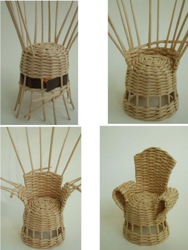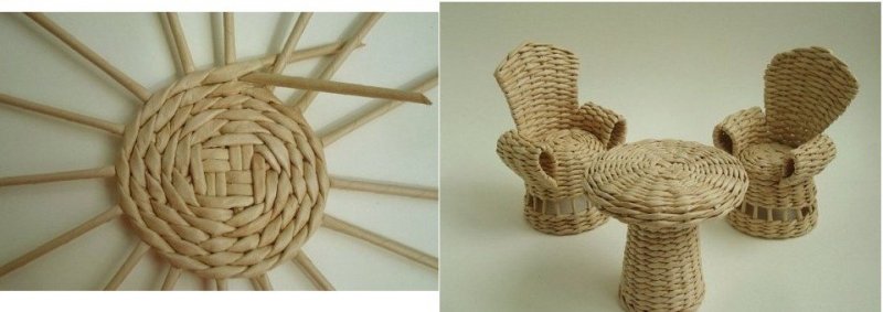 Из картона вырезаются две части будущей столешницы – в углах одной шилом проделывают дырочки для ножек, а по всему периметру – отверстия для бумажных стоек. В уголки конструкции с помощью клея крепятся деревянные ножки, в остальные отверстия продеваются бумажные стойки. Верх второго элемента столешницы оклеивается цветными квадратиками, имитируя клеенку, после чего приклеивается к первой детали. Плетение производится бумажными трубочками, путем продевания их сверху-снизу, чередования в каждом ряду. Последний ряд оплетается косичкой, готовое изделие окрашивается в светло-коричневый колер. Примерно так же изготавливаются стулья.